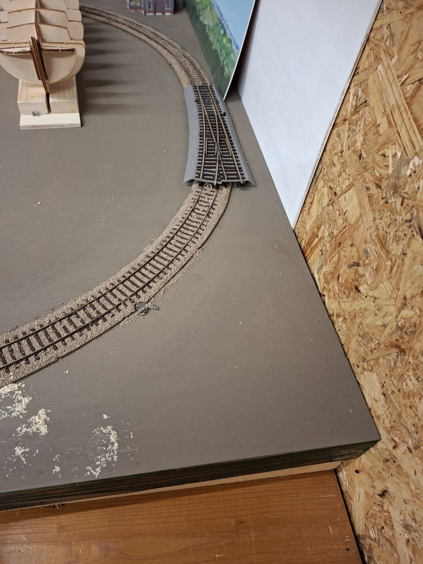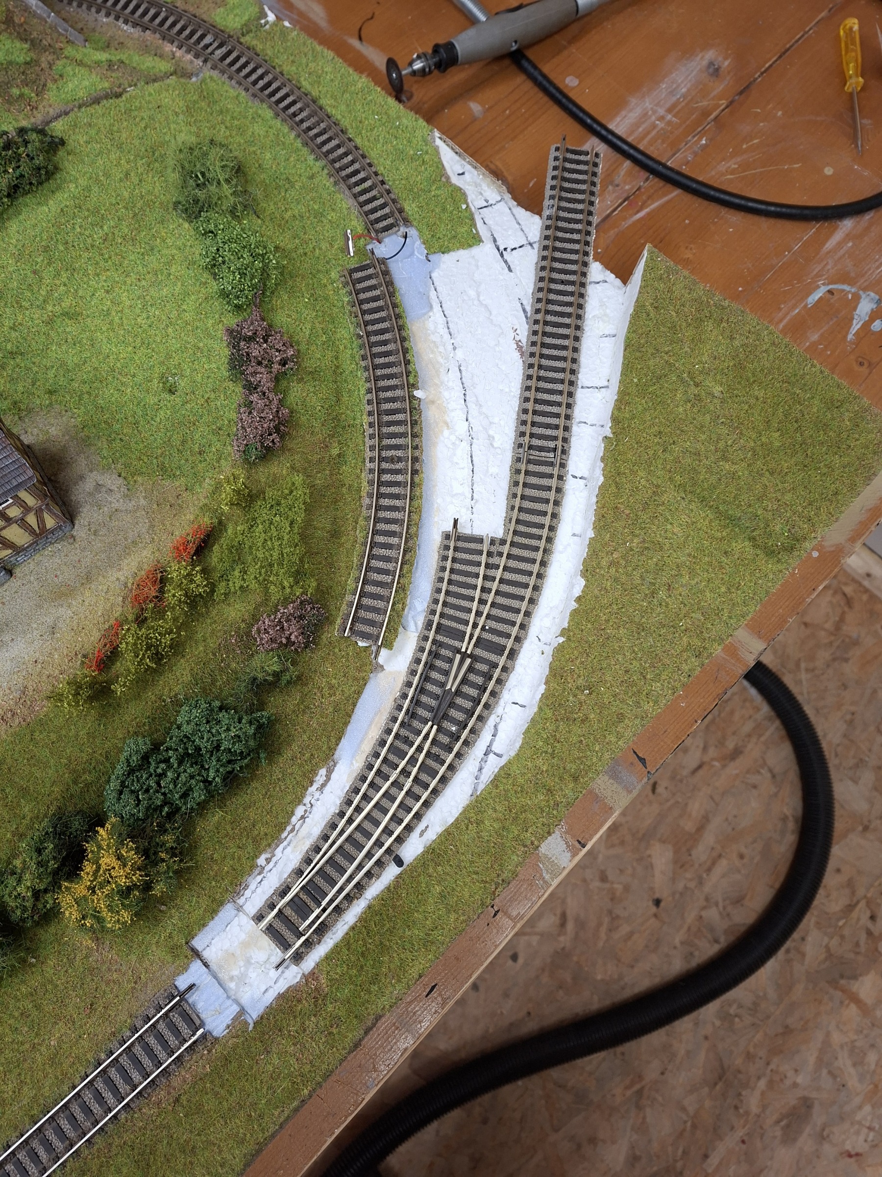 Maar hier gaat het over H0-normaalspoor. Er is niets leukers dan de Dremel in je baan te zetten. De bedoeling is om een keerlus te maken zodat ik met de neus vooruit Meedhuizen weer kan bereiken. Vandaag een begin gemaakt.