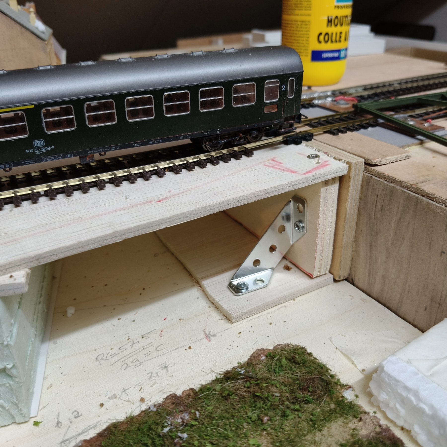 De rest van de ondersteuning XPS blokken, verlijmd, komen nog vast op een voetje van 5mm die ik weer vast schroef en zo ook nog verplaatsbaar.