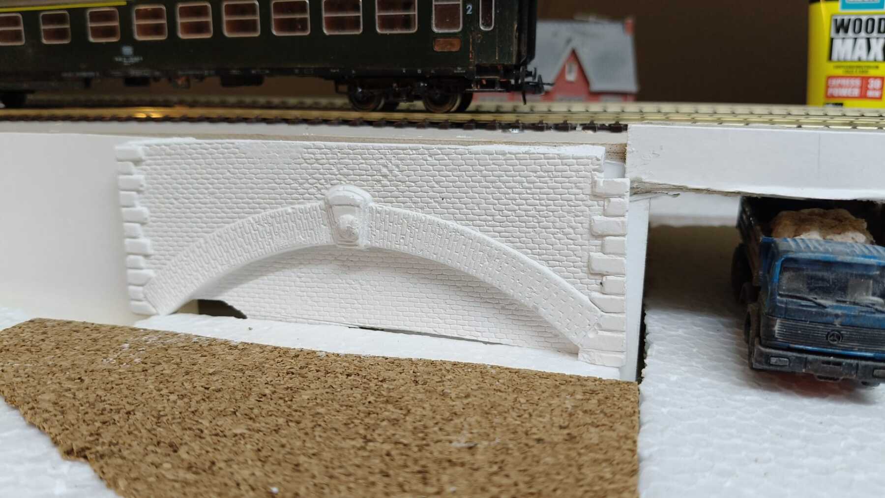 Van die arcaden in plaats van een spoordijk doen wel afbreuk aan het Nederlandse karakter. Je zou er.ook voor kunnen kiezen om de spoordijk niet helemaal tot niveau 0 te laten aflopen maar gewoon op de rand van de module af te kappen op een passende hoogte. Aan de achterzijde volstaat de suggestie.