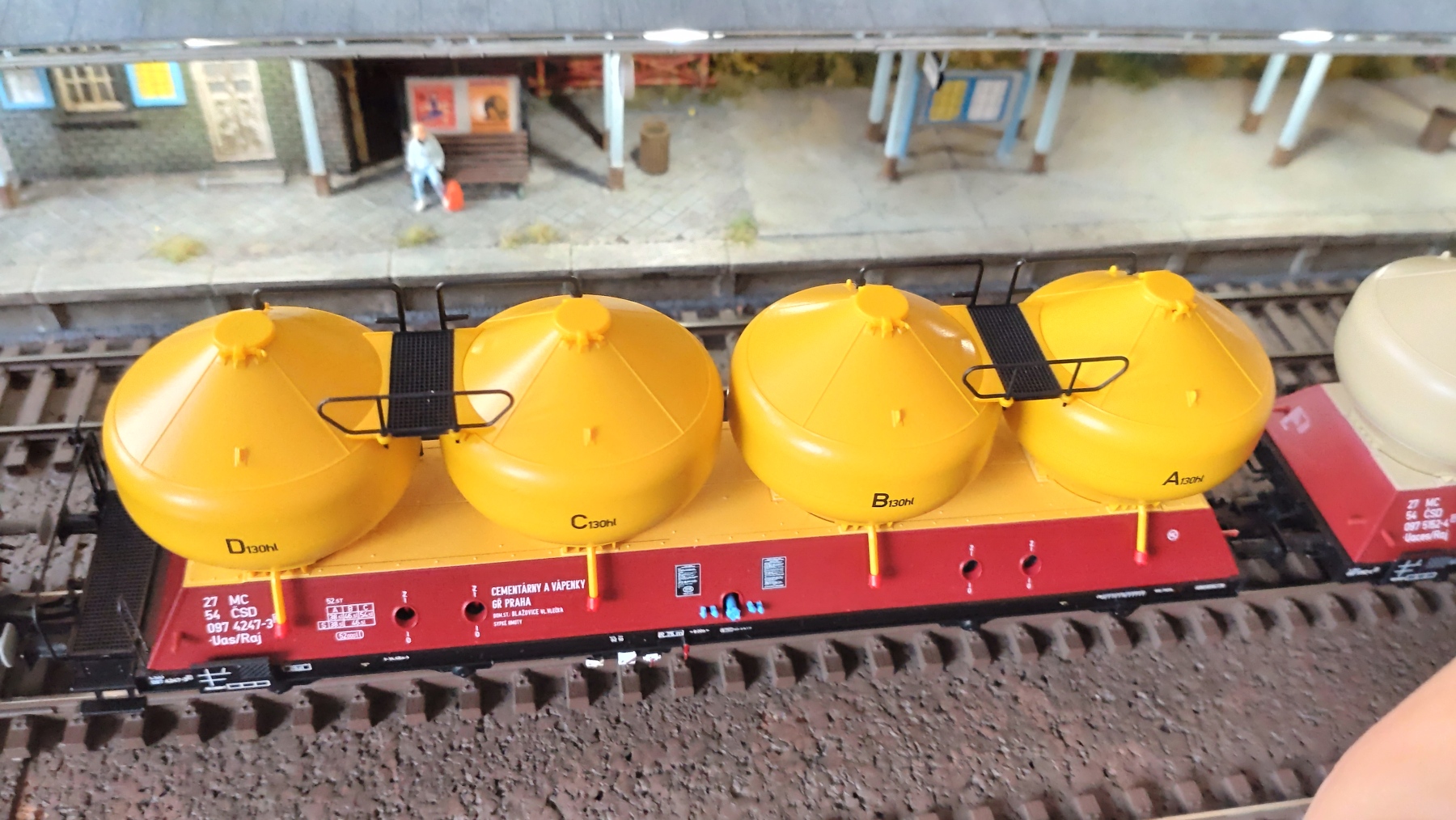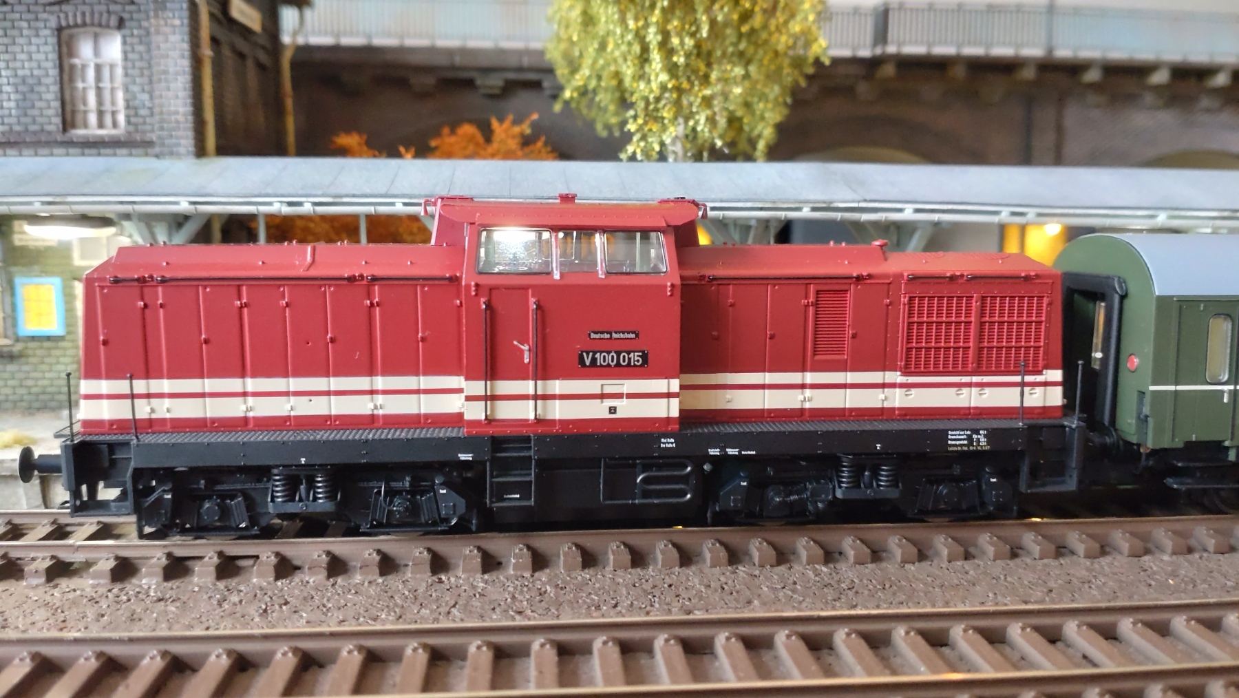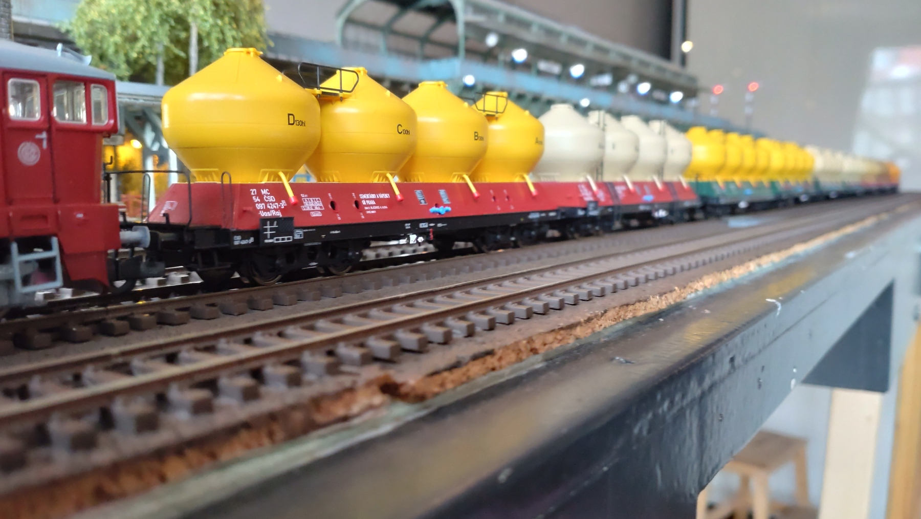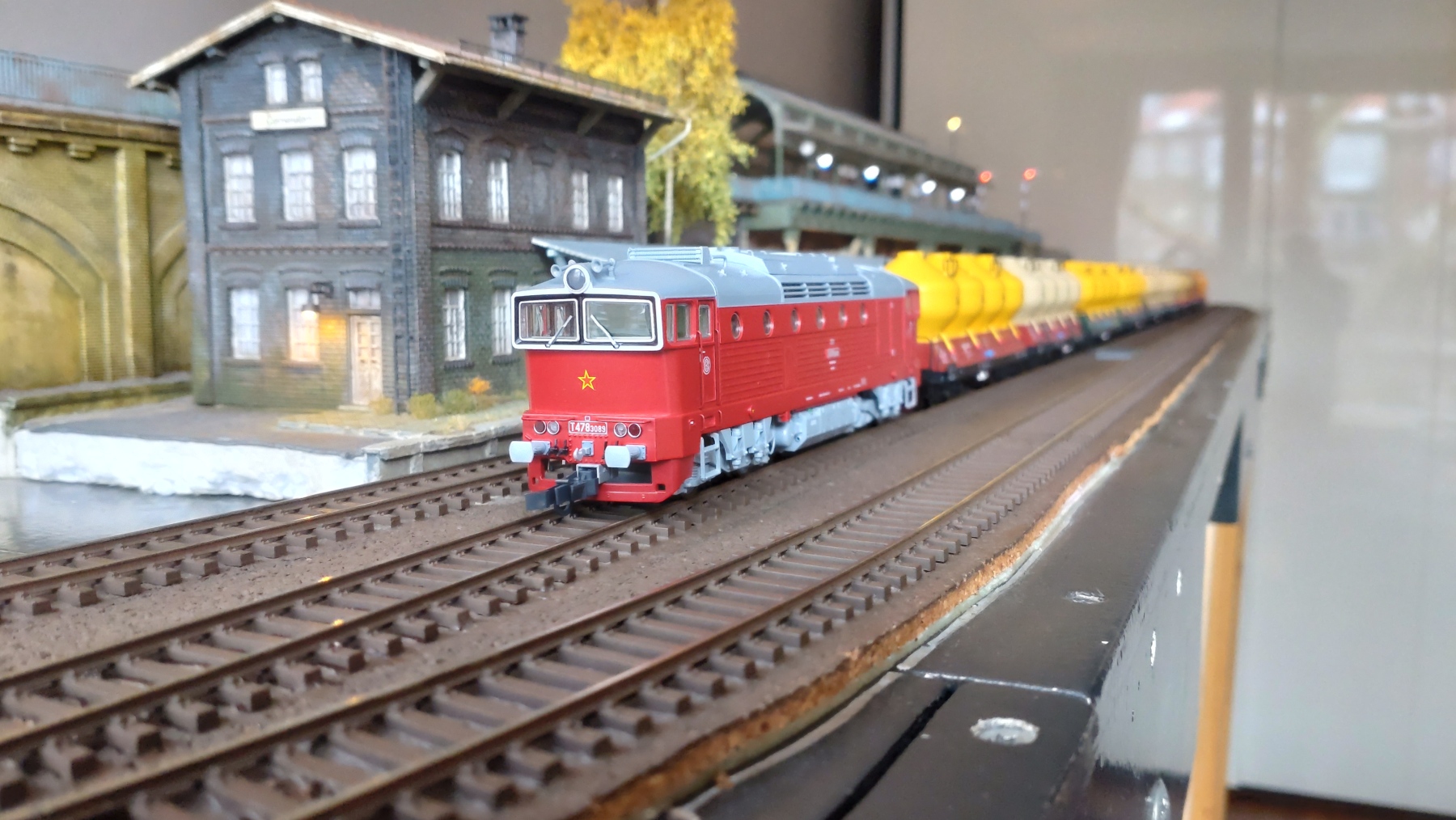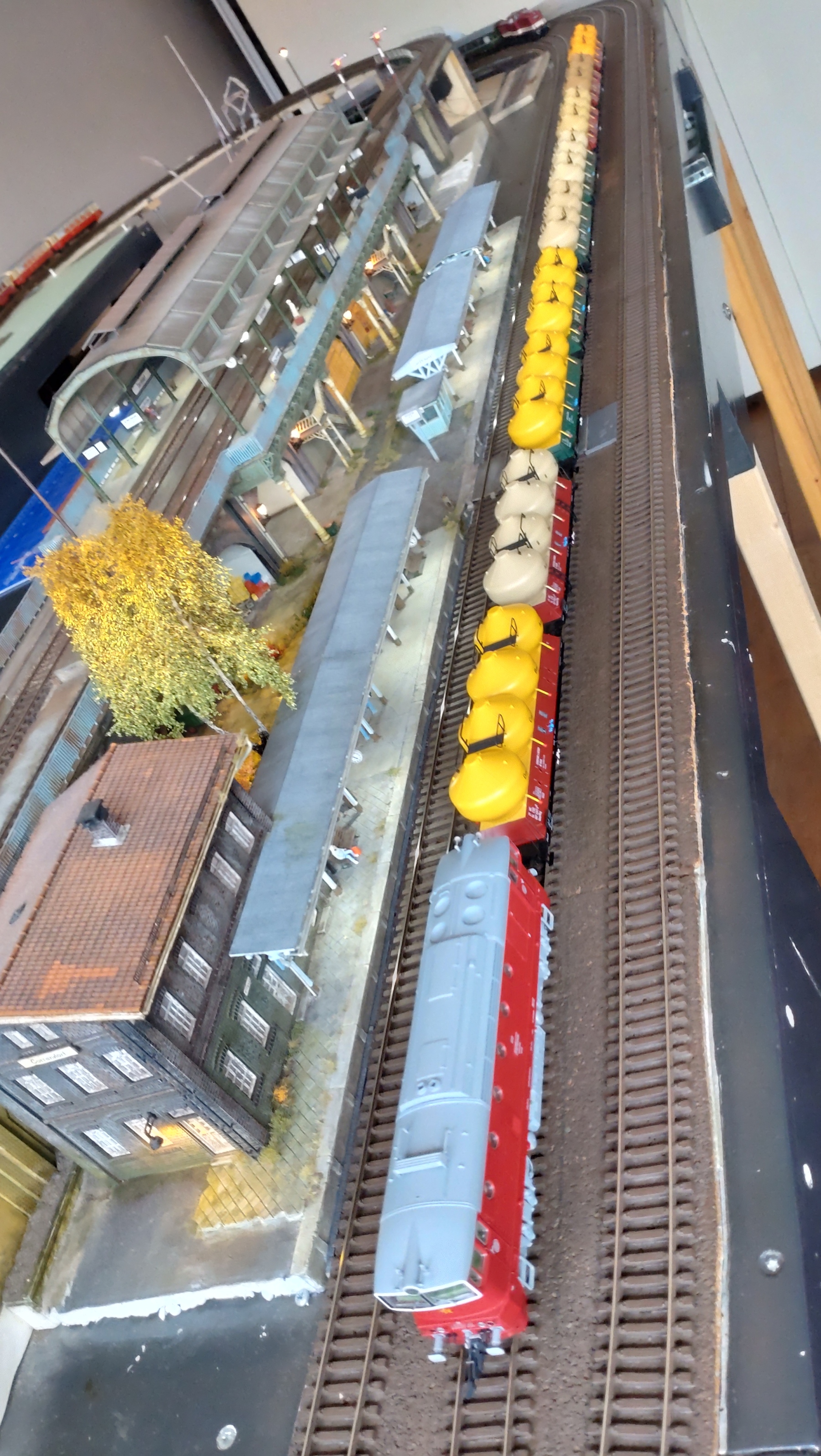 Nou een update dan maar weer eens? Het geveltje van het gebouw voor de voetgangerstunnel is bijna klaar. De ramen zijn in ieder geval klaar. Deze aankomende week zal ik die wel klaar hebben om te gaan verven, dan heb ik de zijkanten van het gebouw klaar en dat is het meeste werk. Vandaag is het even tijd om weer eens wat te rijden. Nieuwe locs die moeten inrijden. Een set silo wagens van 3 (ik had er al 6) kwam ook binnen op Correndorf. Nu een mooie lange sleep van 9 silo wagens. De Brawa V100 en de nieuwe Piko Tkt48 glijden over het spoor. Mooie stille motor en goede rijeigenschappen.