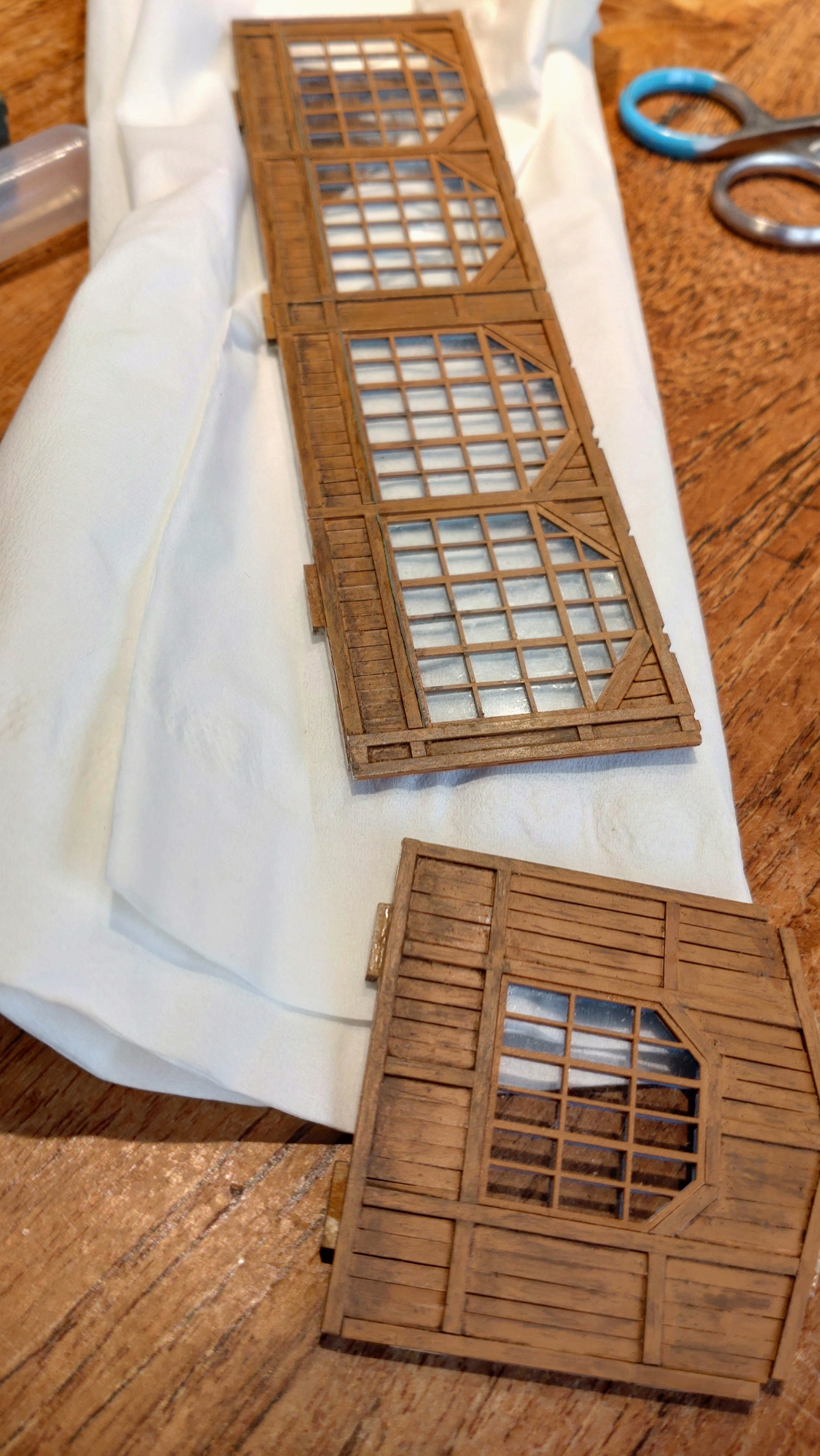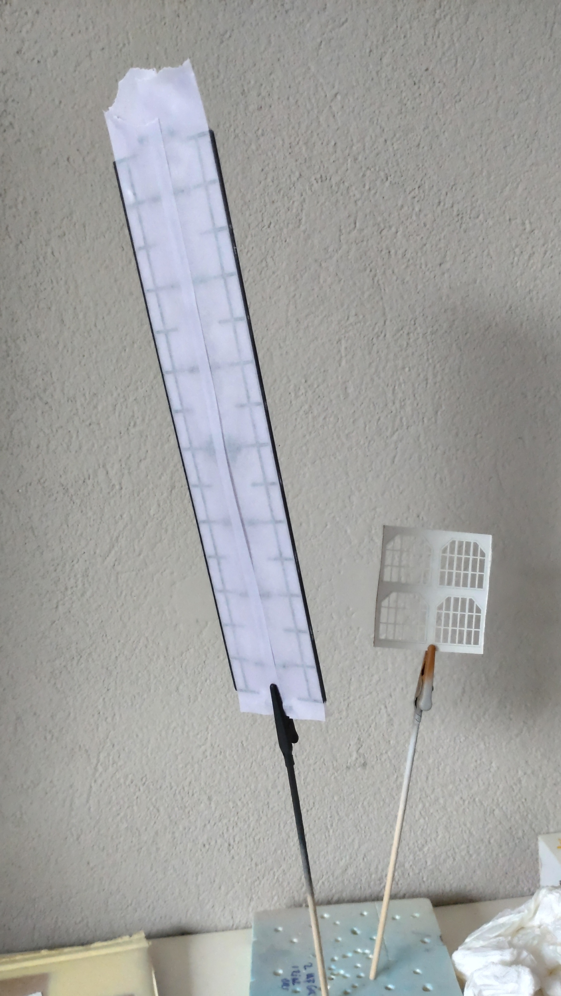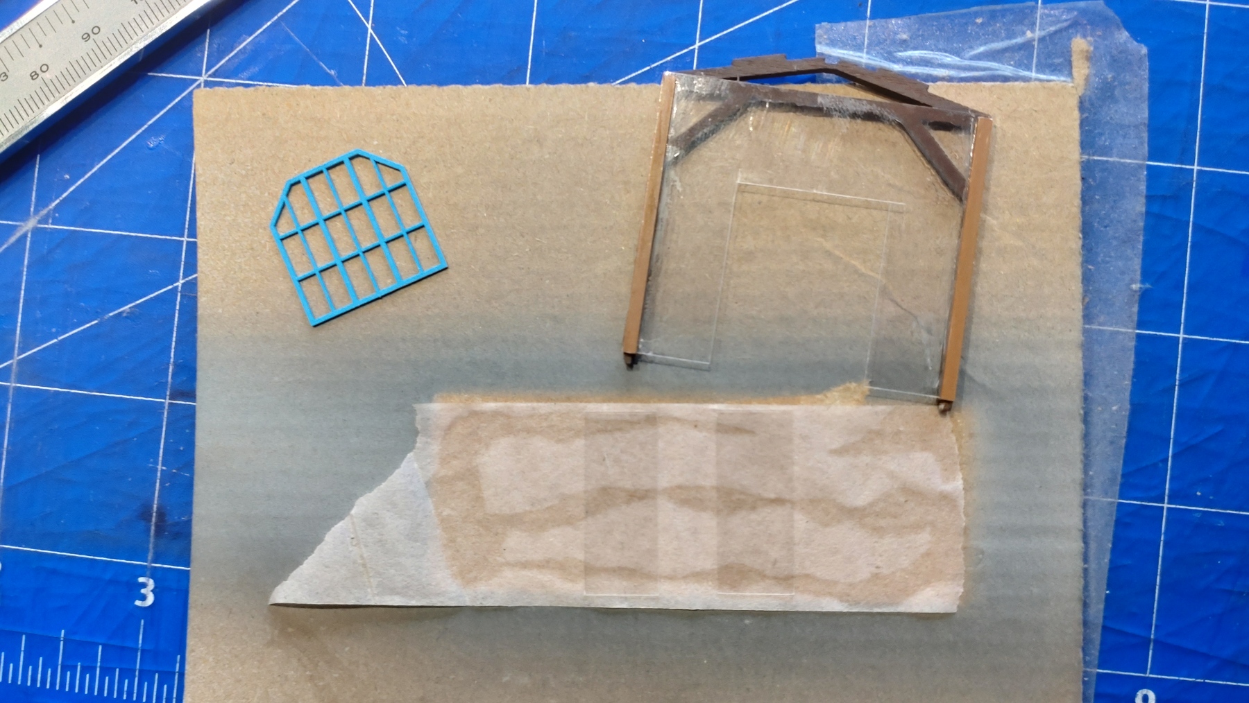 Oja de binnenkant van de achterkant is gemaakt. Alleen de buitenkant moet nog. Zoals je ziet heb ik de achterkant gemaakt op het glas, en aan allebei de kanten plak ik de in het voor geverfde stripjes op. De achterkant was zo klaar aangezien ik daar de ramen uit de bouw kit voor gebruik. En de voorgevel met 2 openstaande deuren, die moet ook nog gemaakt worden.