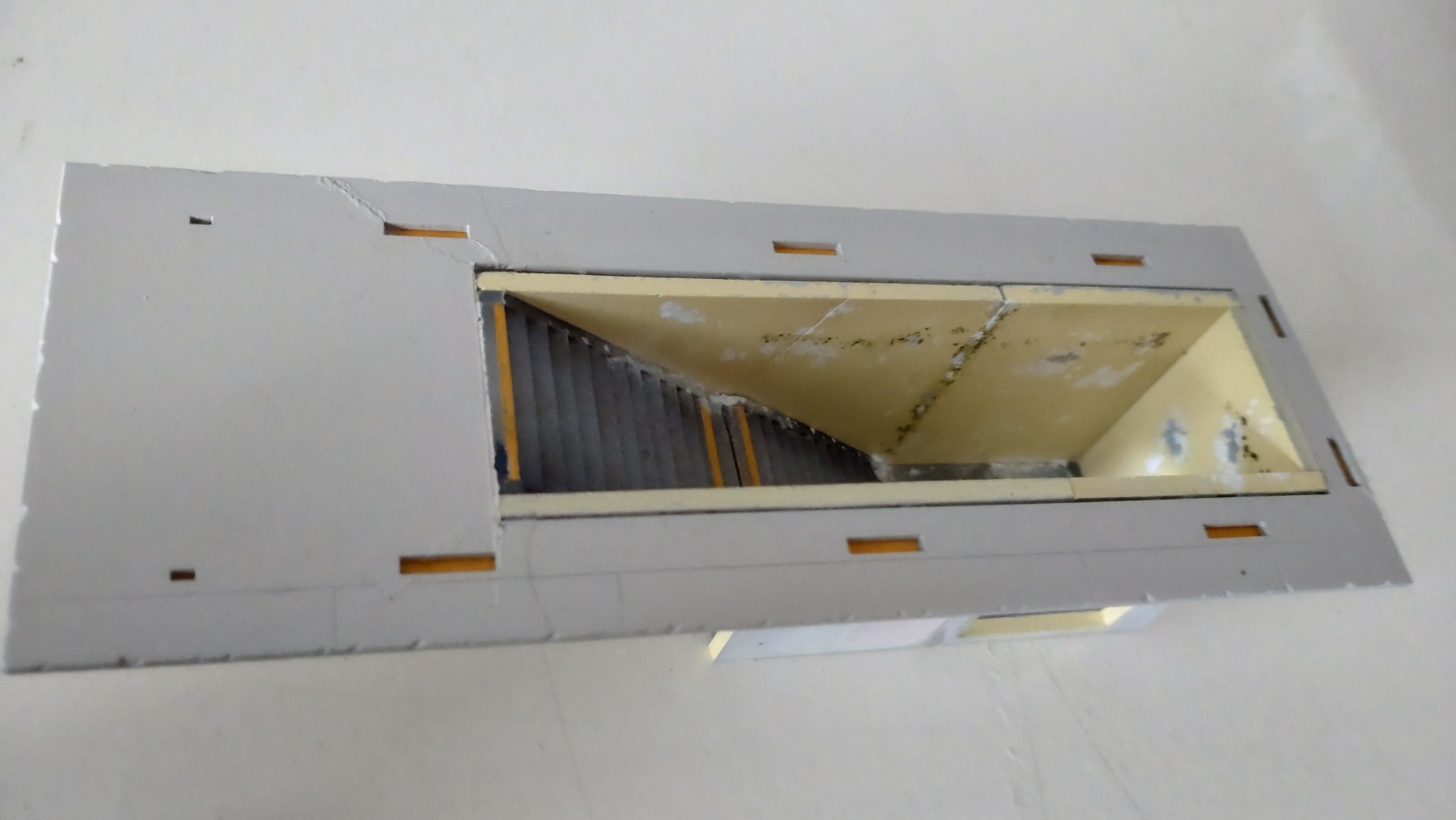 Omdat het een bouwkitje is wat ik sterk heb verbouwd, is met het afkomen van de wanden ook meteen het gebouw bijna klaar. De binnenkant van het dak heb ik al geverfd, de goten en regenpijpen moeten nog 1 laagje en een wash. De buitenkant van het dak moet ik nog verven, 2 bankjes voor in de hal heb ik kant en klaar liggen, geverfd en al. Alleen de trapleuning nog en de voorkant, de eindstreep is in zicht.