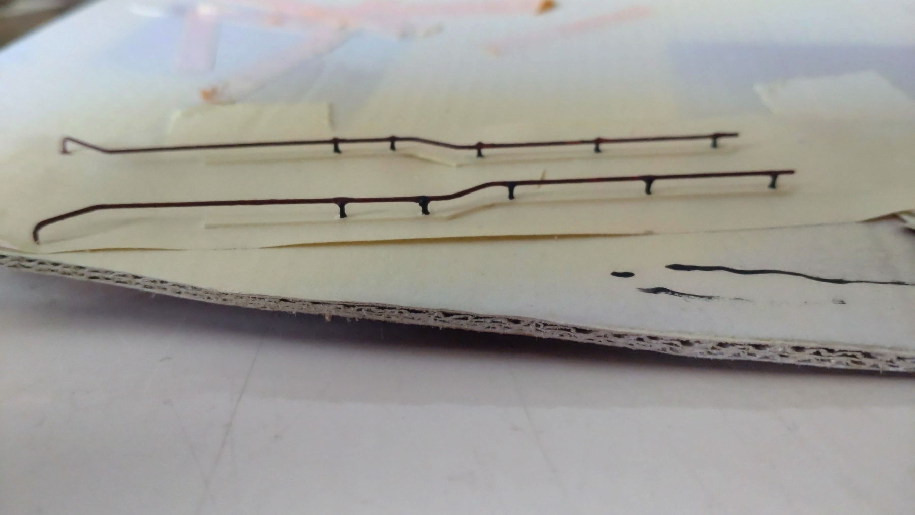 Werkstukje van de week; trapleuningen maken. Dit is poging 3 ofzo, ik ben benieuwd of het lukt deze wel heel te houden. Geprobeerd om te solderen maar dat lukte niet. Dan maar andersom denken en beginnen met bouwen op een eerst gemaakte smetplank. De lijm droogt inmiddels dus hierna even spuiten en proberen op de muur te krijgen.