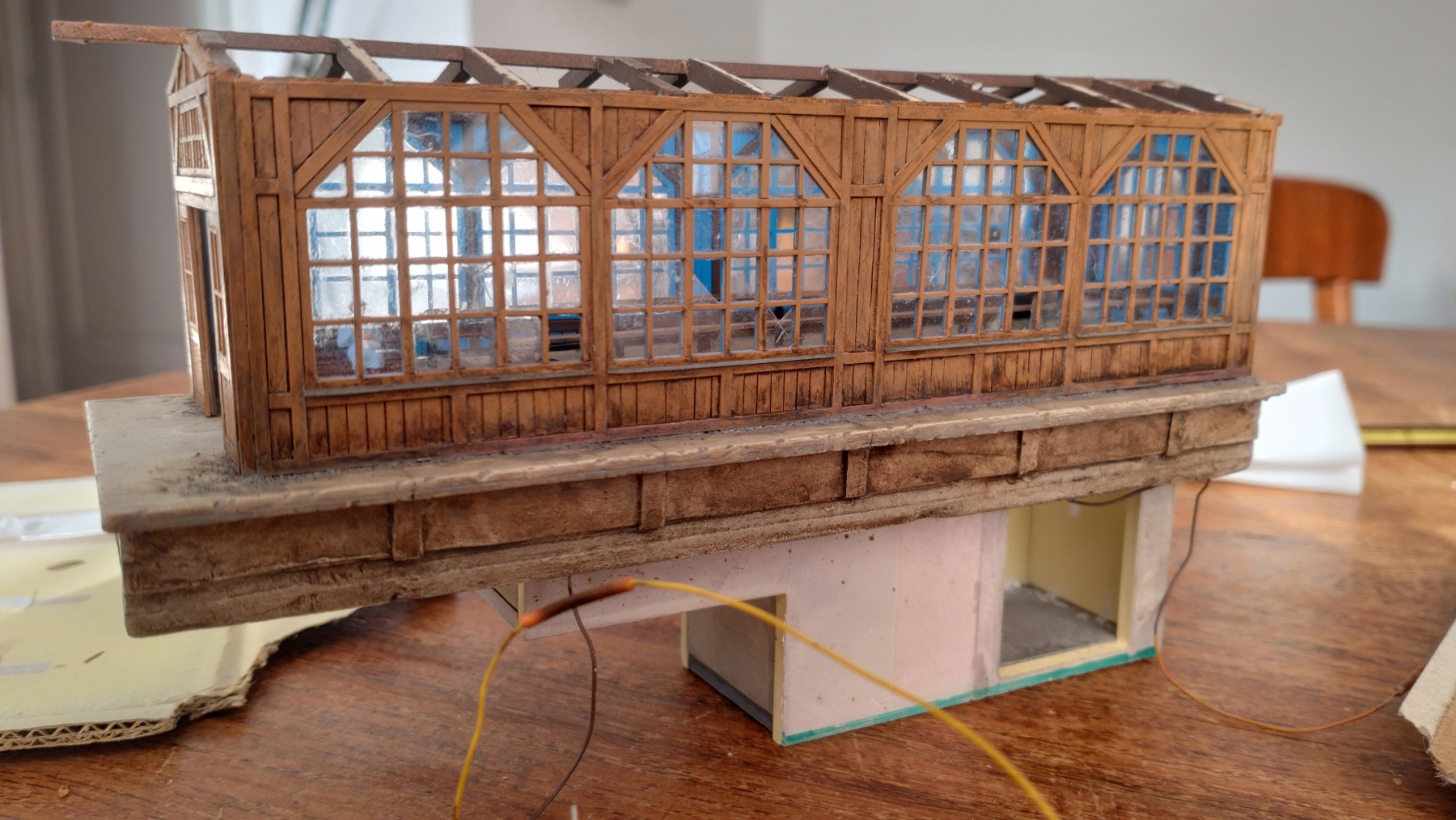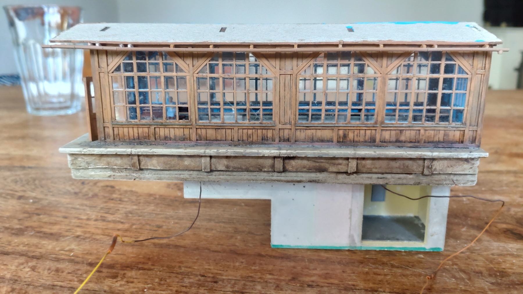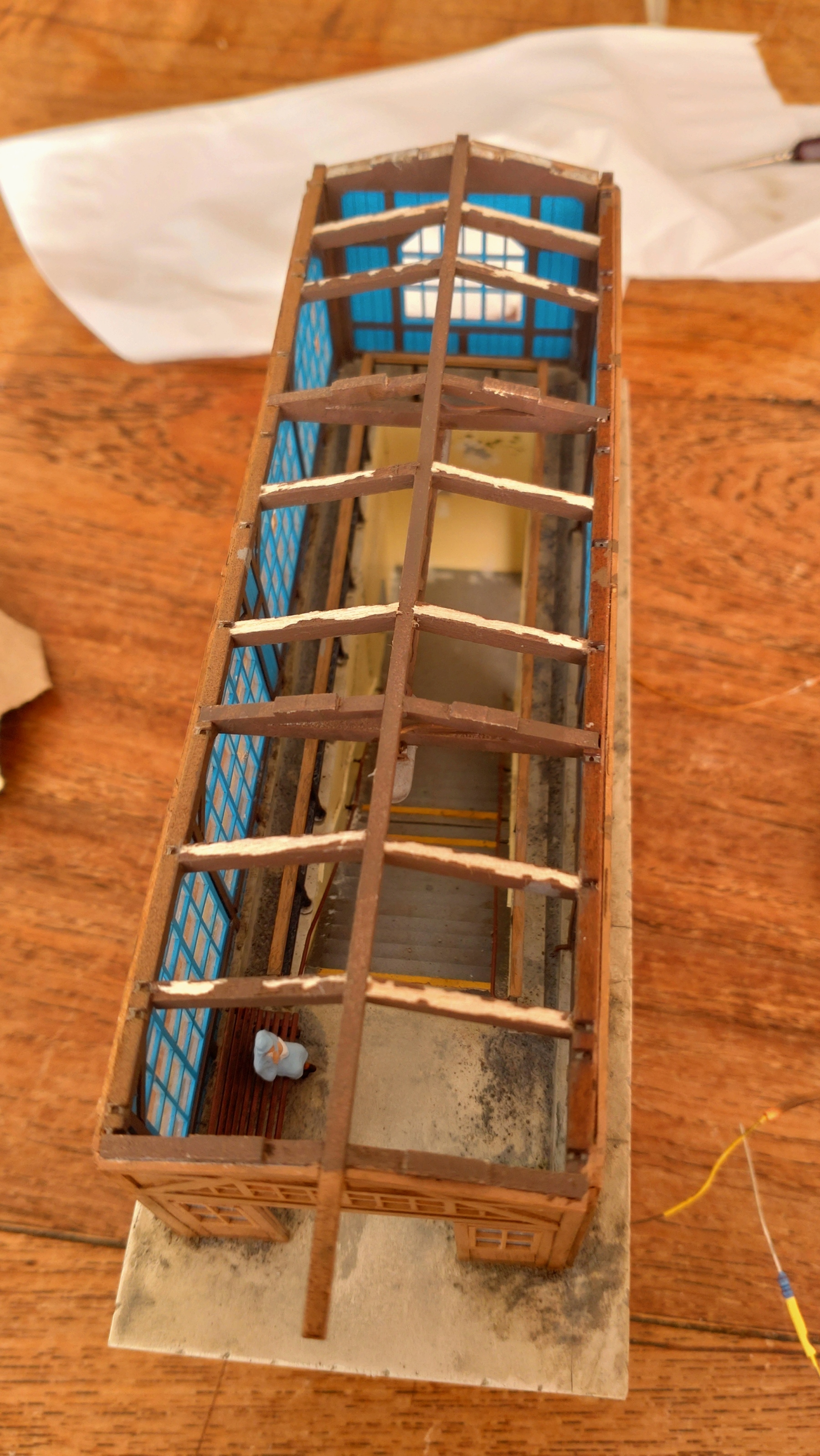 Het plaatsen ik heb er wel vertrouwen in, ik heb gelijmd met de Magic bond ultra superlijm, dat is de sterkste die ik heb. Veel sterker dan gewone superlijm. De smetplank zit op roze Tesa schilderstape en die is minder tacky. Die smetplank heb ik trouwens 2 tinten lichter gespoten dan de muur. De leuning en afstandhouders zijn 0.5 mm messing draad.