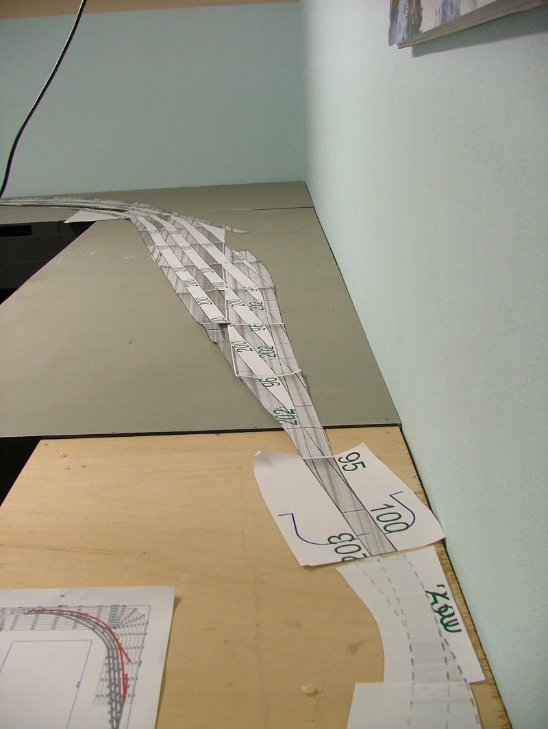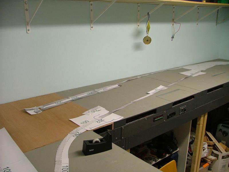 Voor het zichtspoor is eerst de printer aan het werk gegaan. Het baanplan heb ik 1:1 uitgeprint, uitgeknipt en aan elkaar geplakt om te kijken of het bedachte past in de ter beschikking staande ruimte.