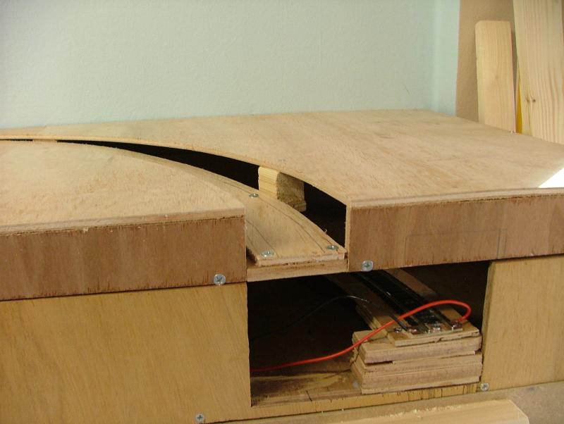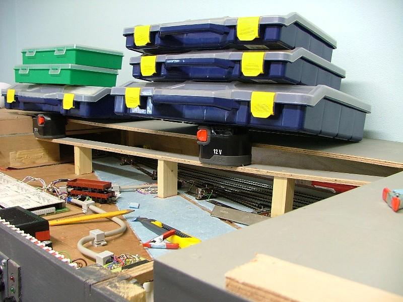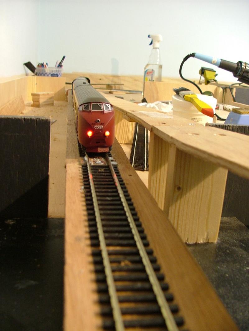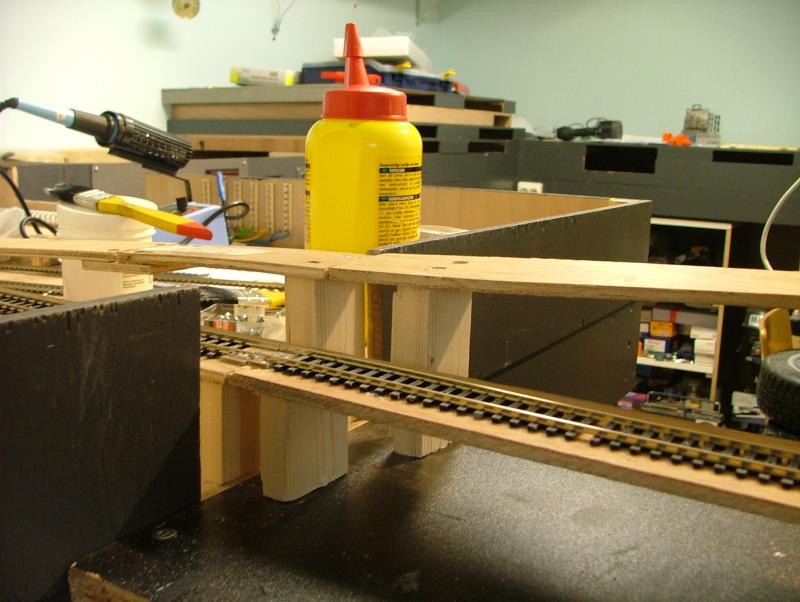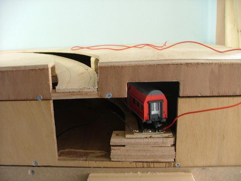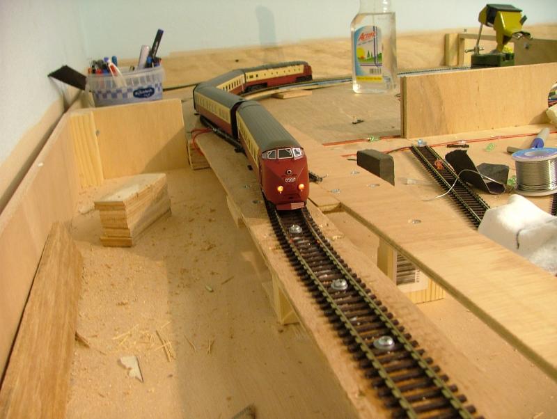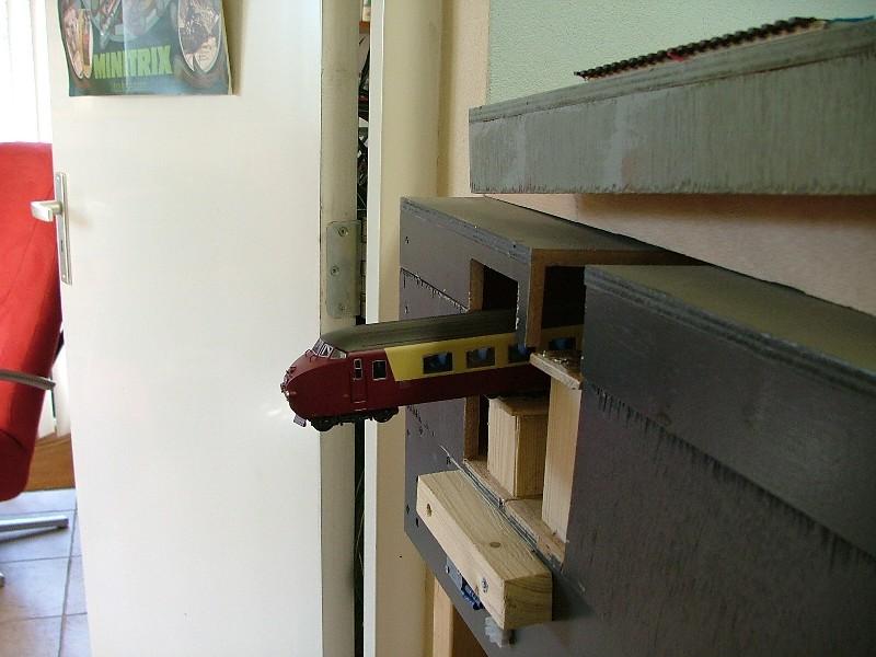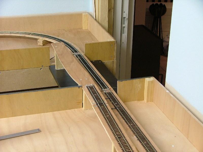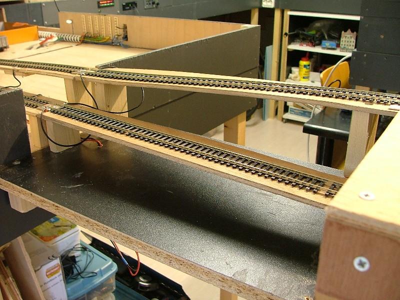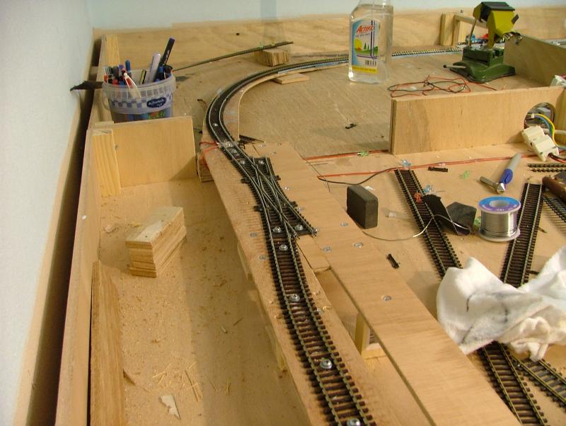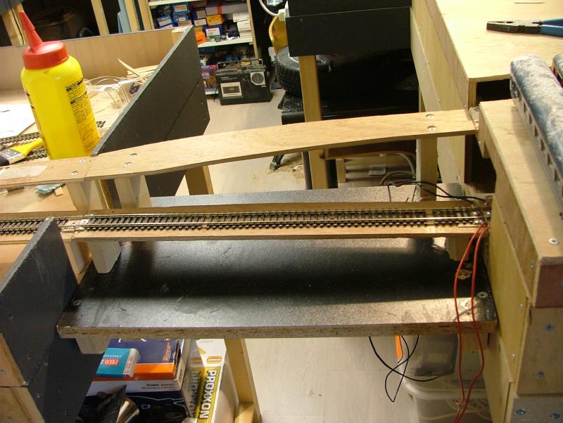 Vervolgens een aanvang gemaakt met het realiseren van het "moeilijkste gedeelte." Dwz het punt waar het zichtspoor en het ingangsspoor naar het schaduwstation elkaar kruisen mbv een "Engelsman" op ca. halve hoogte. Door het schrappen van de railspiraal blijven er op een vrij korte afstand toch behoorlijke hoogteverschillen te overbruggen. Eerst maar proberen of het wil lukken....