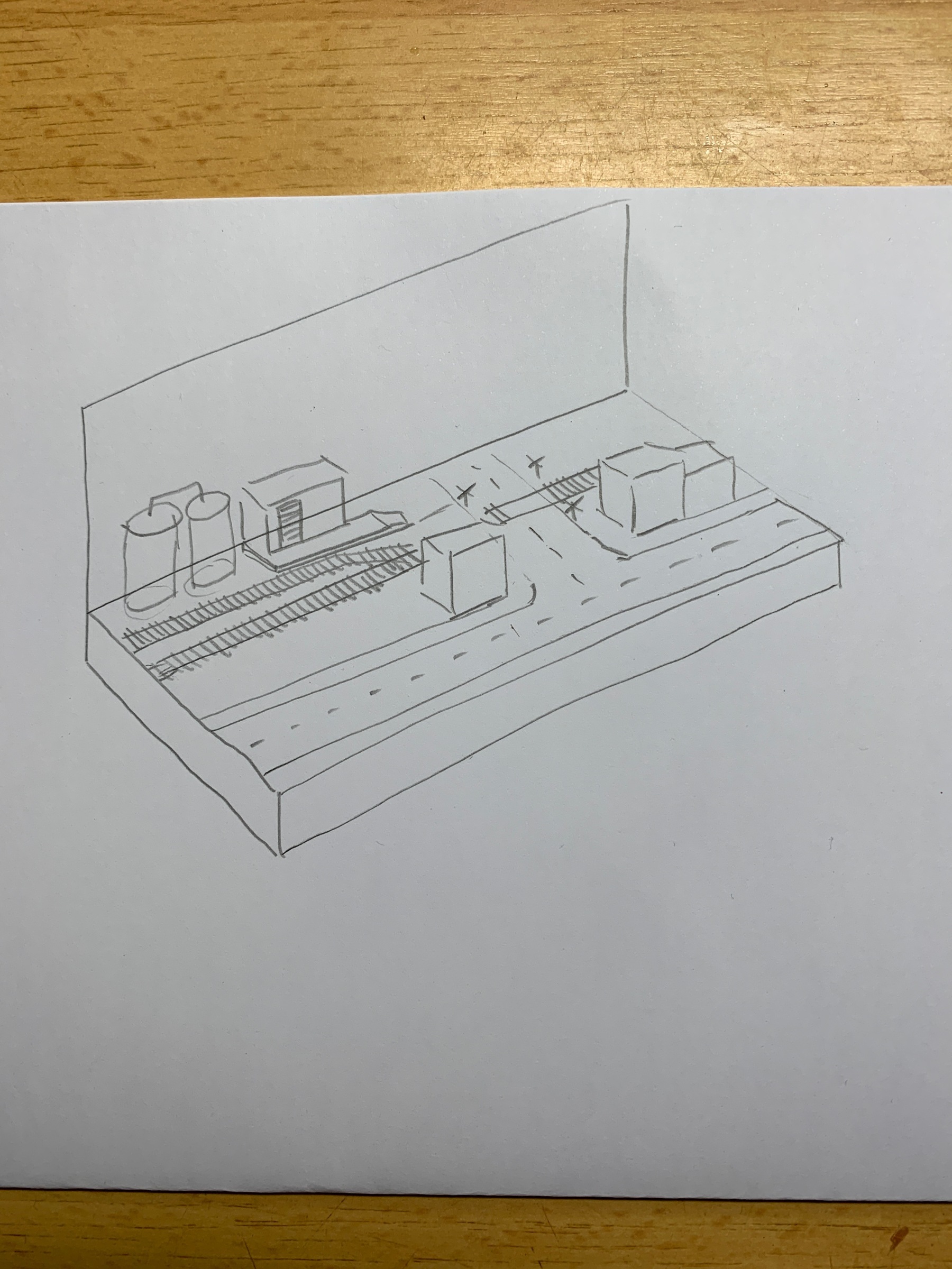 Het idee ontstond om een US micro layout in halfnul te maken. Heel eenvoudig, als vingeroefening voor modelbouwtechnieken en tegelijk om een soort van vakantieherinnering te maken. Gewoon de omgeving van een landelijk dorpje met een hoofdspoor en wissel naar lokale industrie. Een soort Inglenook. Een eerste schets geeft weer wat ik in gedachten heb: een loodsje voor wat stukgoed waar een boxcar of reefer bij kan staan, en een silo waar hoppers beladen kunnen worden. Nu staan silo’s en loods nog naast elkaar, maar misschien kan de loods beter naar de voorzijde verhuizen. Het hangt er vanaf of het hoofdspoor doorgaand wordt, of niet. Verder ga ik nog een achtergrond met in de verte een berglandschap schilderen, met inspiratie uit Yosemite.