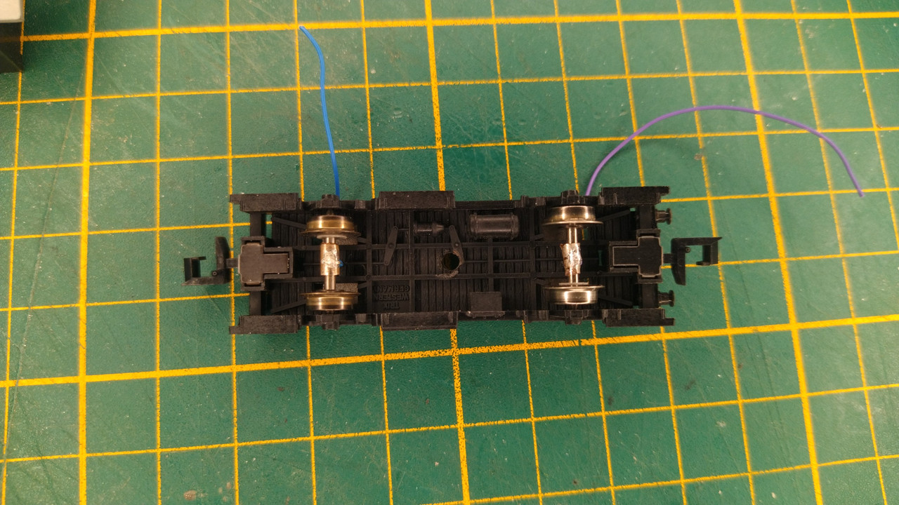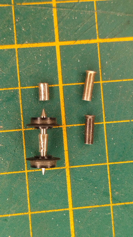 Helaas hadden beide wagonnetjes kunststof wielen, dus die zijn vervangen door metalen. Van aderhulsjes maken we busjes die om de as passen.