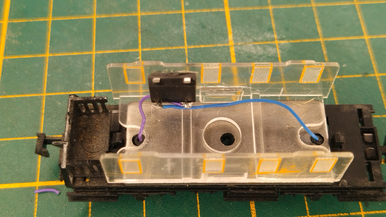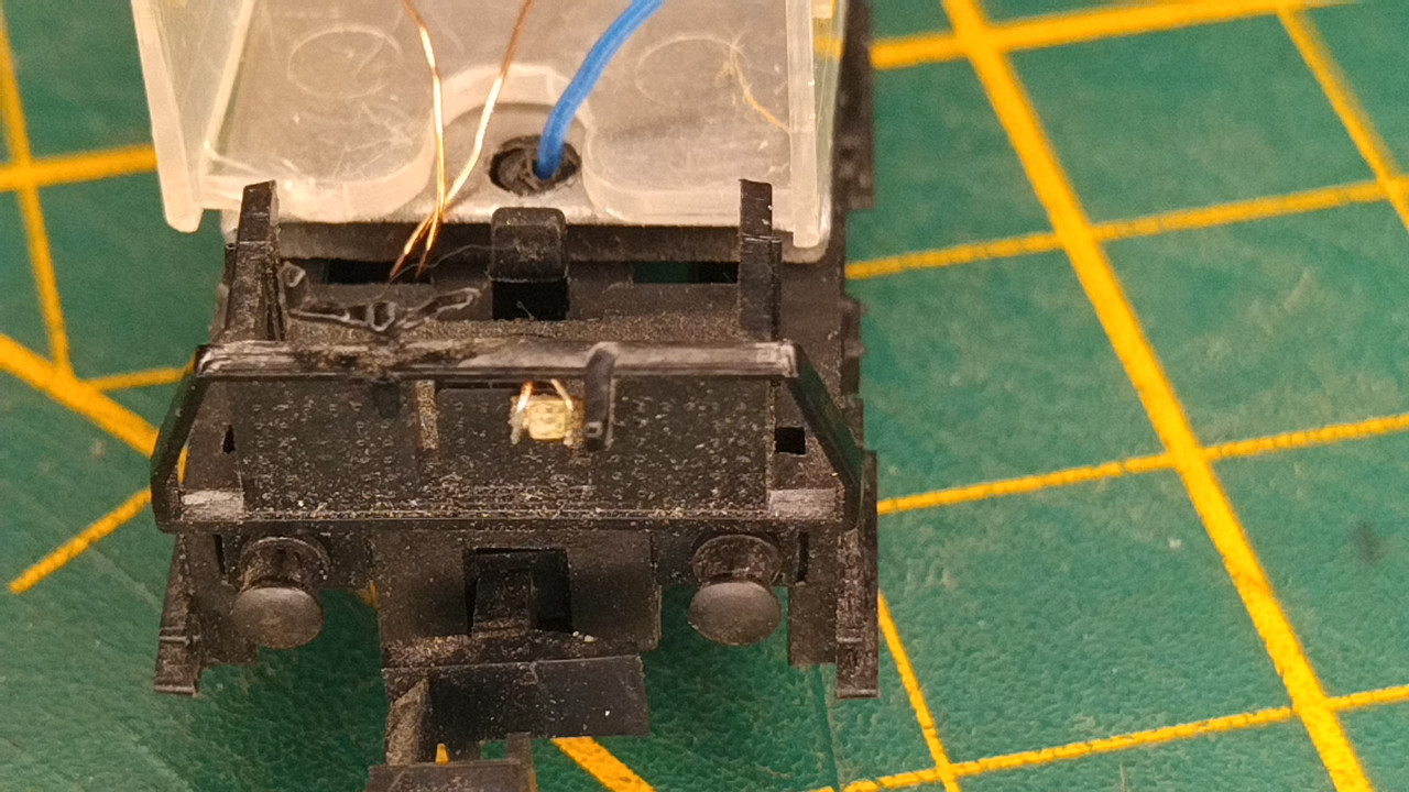 Bij 1 wagon heb ik met een 0201 ledje en emailledraad van een oude elektrische tandenborstel een sluitlicht gemaakt en op het bordes geplaatst. Een smd voorschakelweerstand van 43K gebruikt, want rode leds zijn nogal fel.