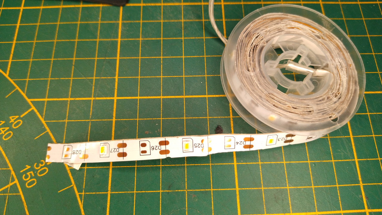 Voor de binnenverlichting gebruik ik ledjes van een batterijledstrip van de Action. Gemakkelijk in stukken te knippen en de strip is zelfklevend.
