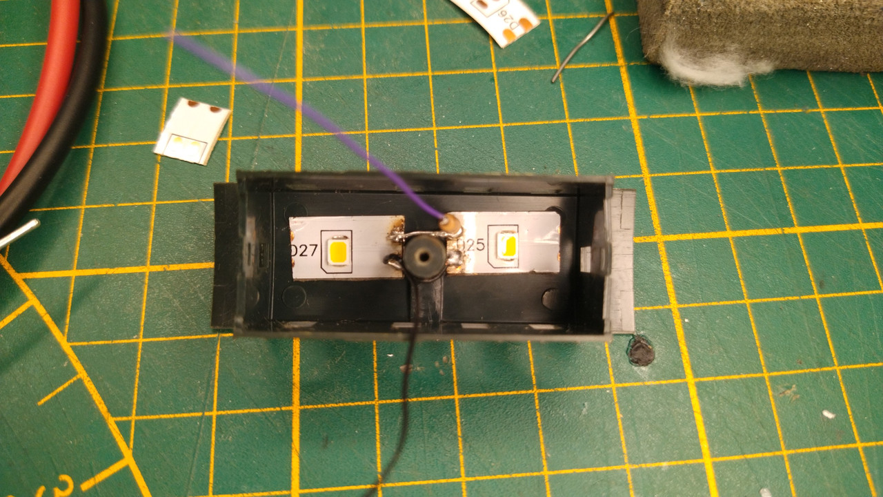 Die kun je na het solderen van de voorschakelweerstand (27 KOhm) en de aansluitdraden makkelijk aan de binnenkant van het dak plakken. De draden worden aangesloten op de diodebrug. Ook hier weer letten op de polariteit, anders geen verlichting!