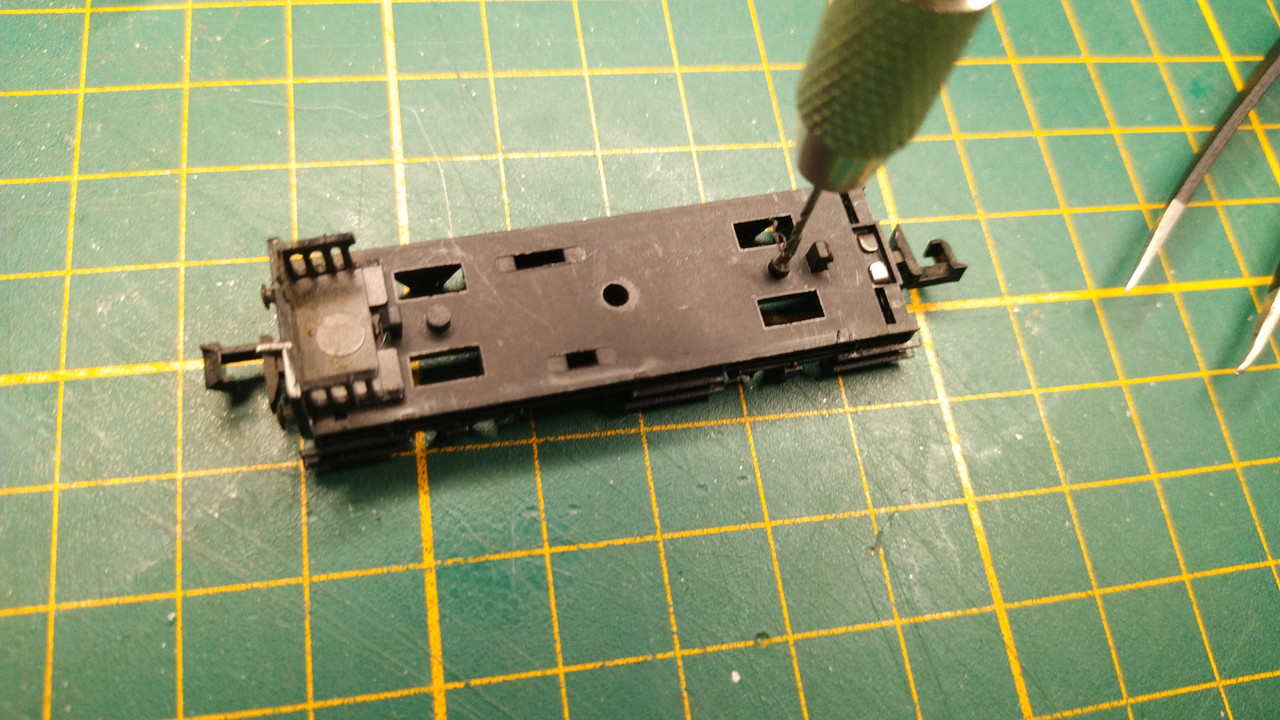 Met een handboortje maken we in de nokjes die het metalen gewicht op de plek houden een doorgang voor decoderlitze.