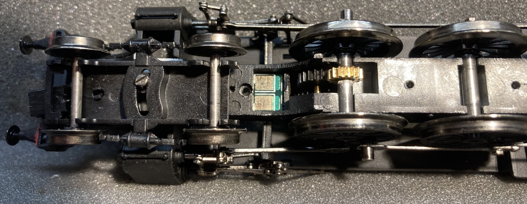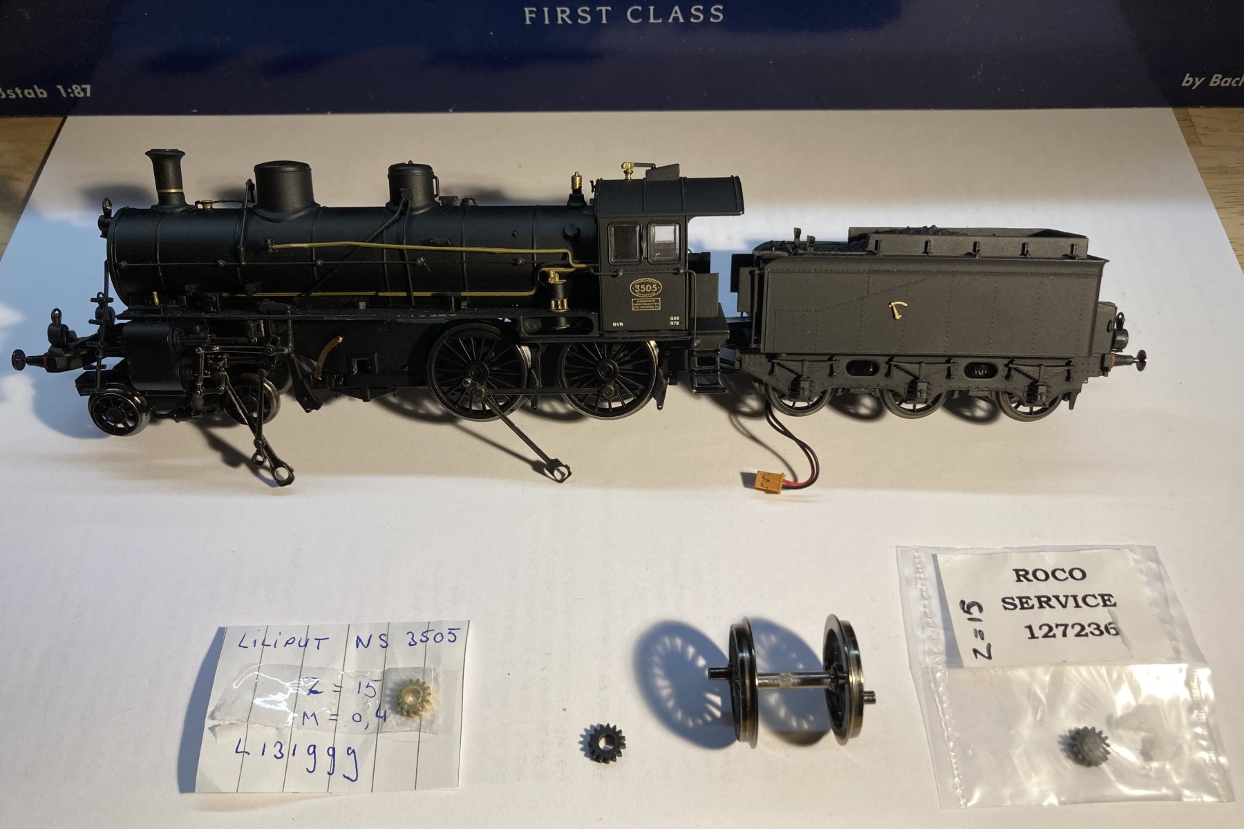 Maar ook hier heeft het AW werk aan: het tandwiel is gebarsten, zoals bij al deze locs. Via een gezamenlijke inkoopactie is een alternatief van messing besteld. Daarnaast is bij Roco, op de gok, een tandwiel met dezelfde specificaties besteld. Dat heeft een kleinere asdiameter, waardoor het niet zonder aanpassing past. Uitboren zou kunnen, of
