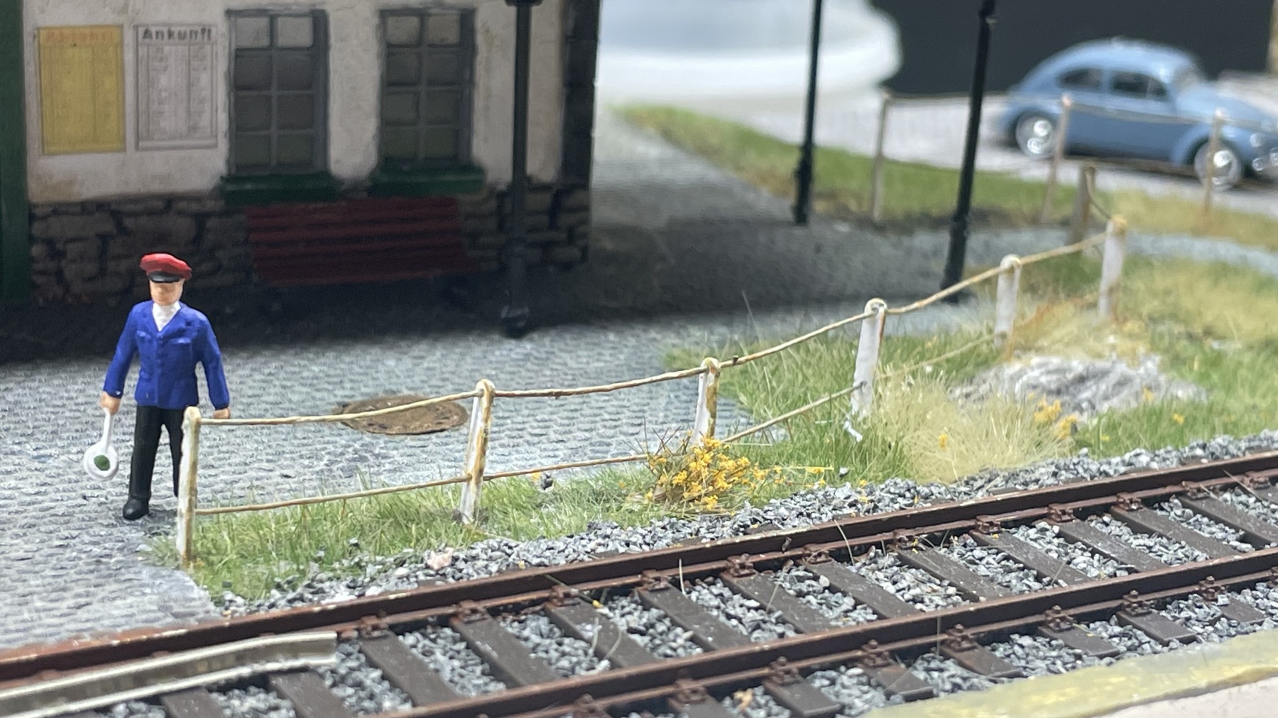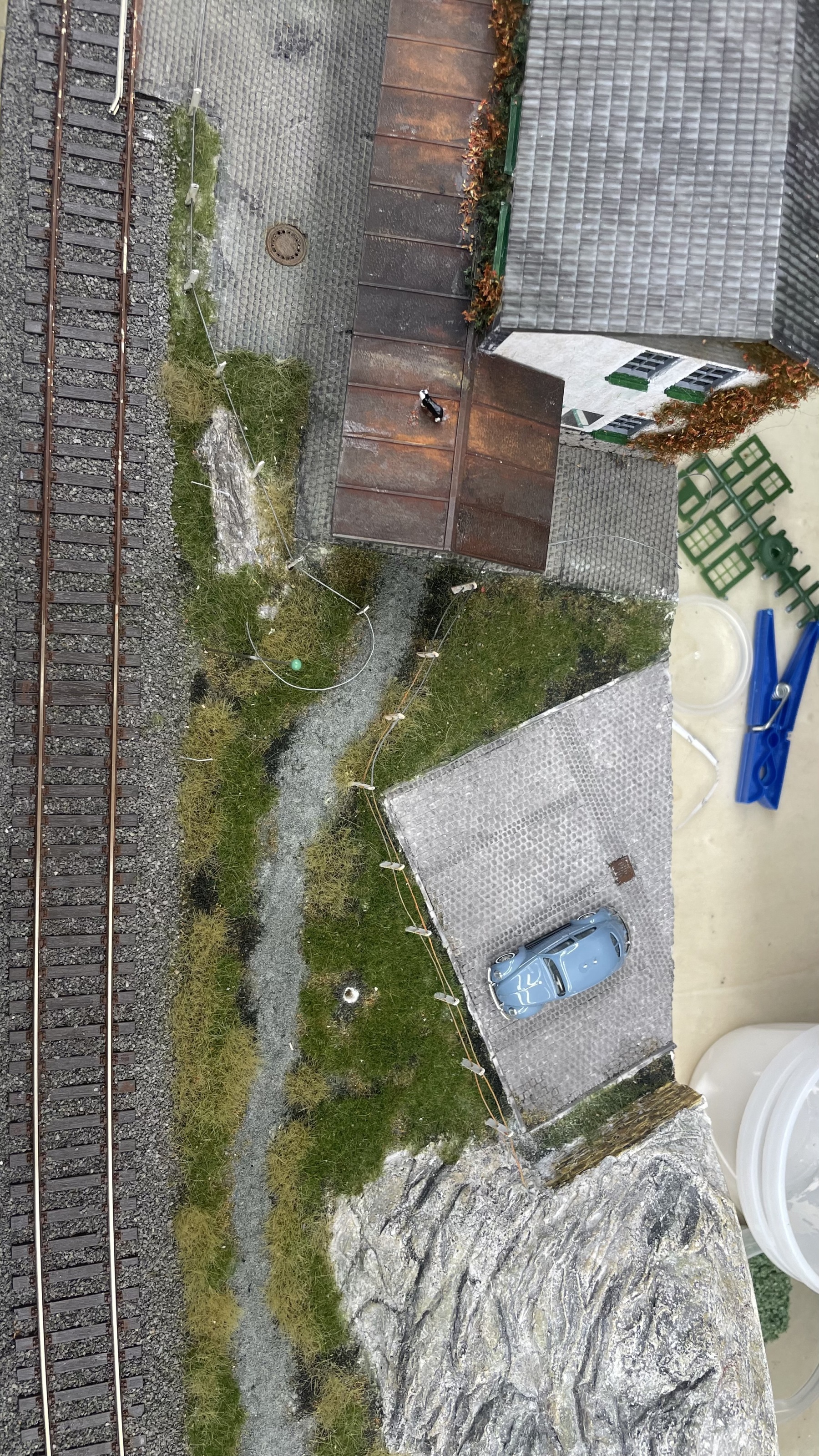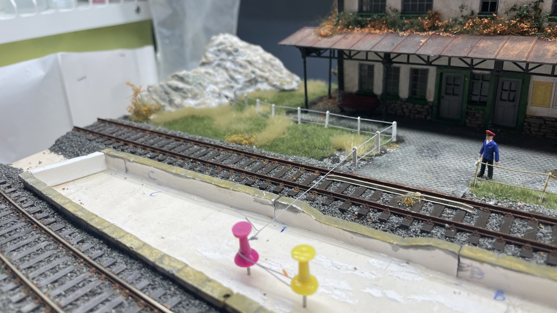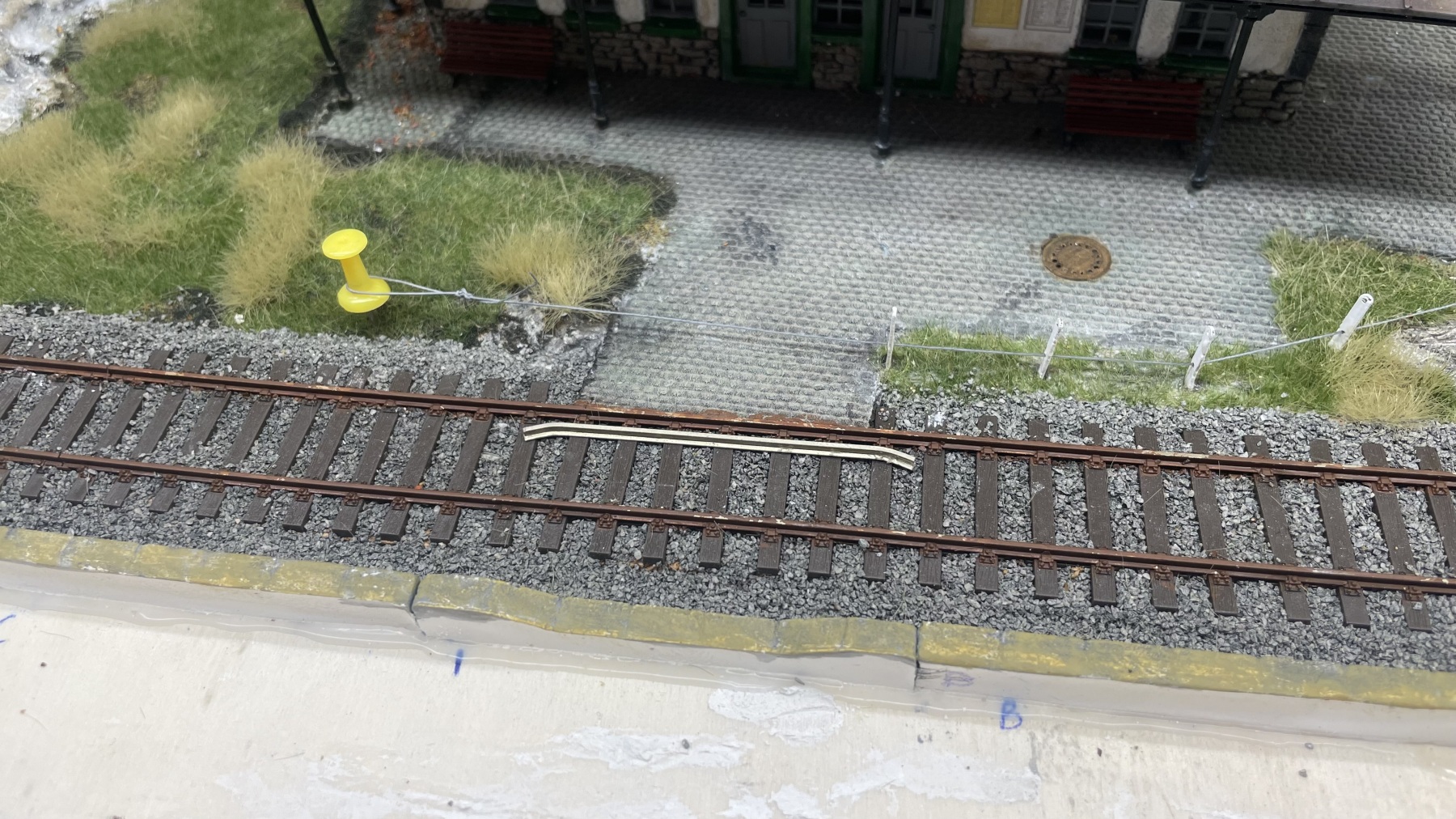 Terwijl de eerste draad in het volgende hek aan het drogen is maar eerste aanzet tot spoorovergang gemaakt. Behoeft nog wat aanpassing