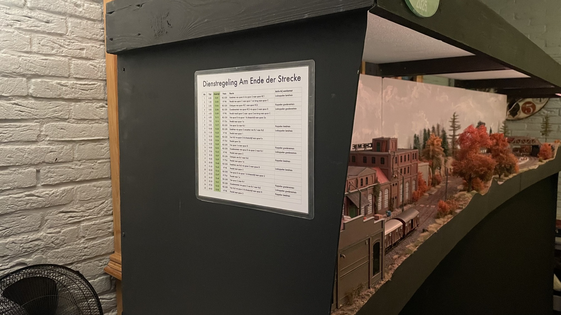 Dienstregeling hangt inmiddels naast de laptop, nu nog even los hekwerklijmen en een loshangende elektrakabel bij het industriegebouw.