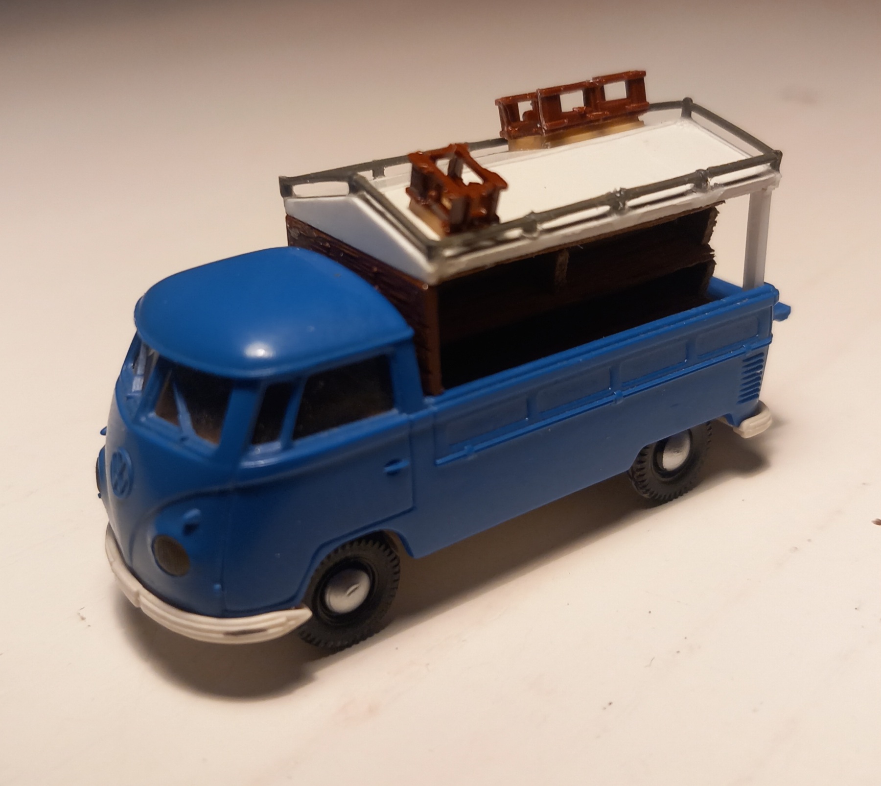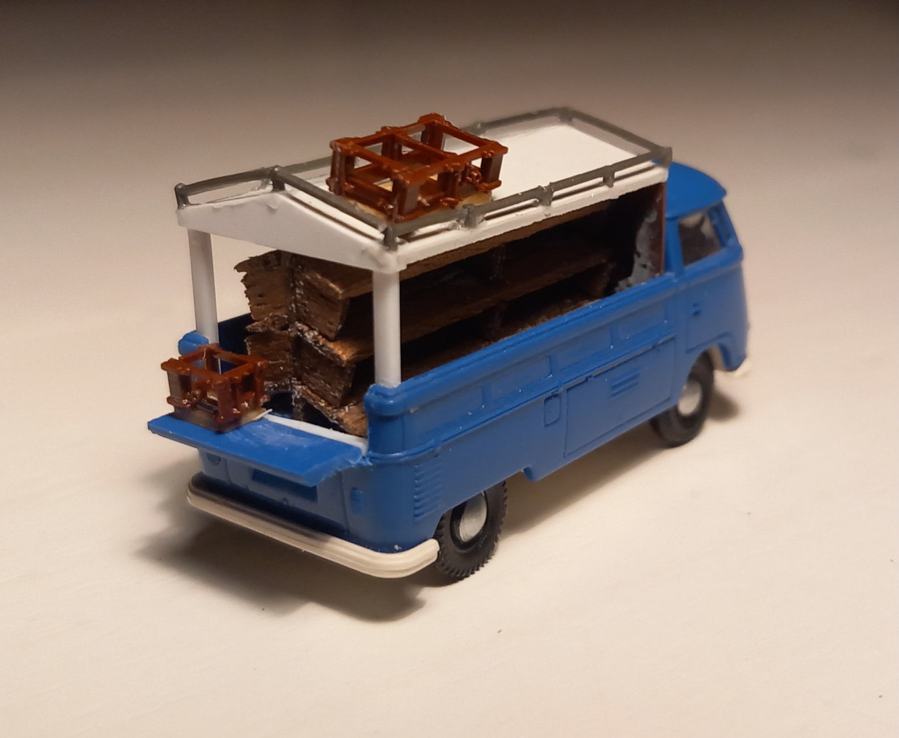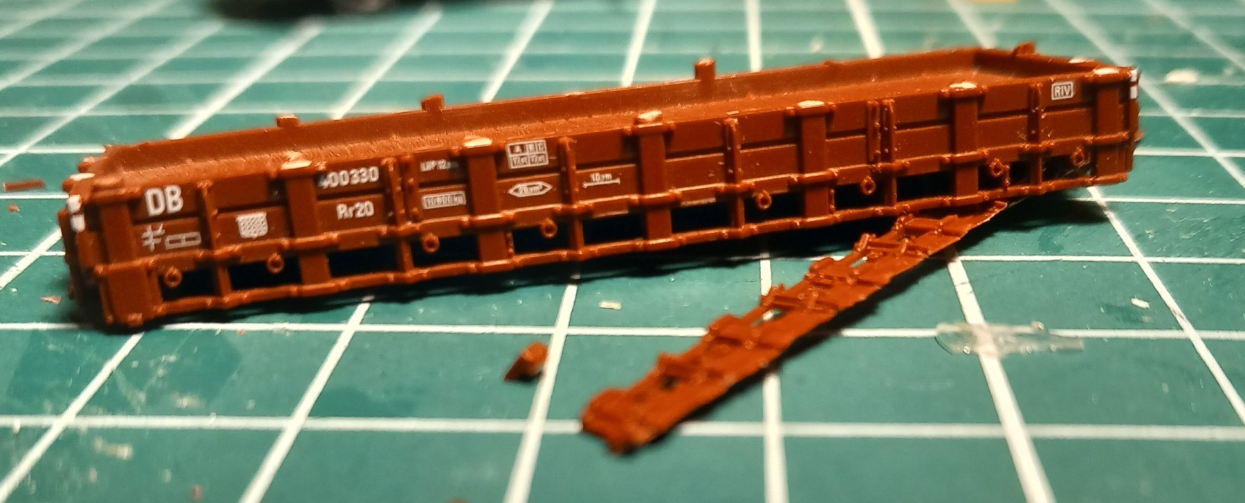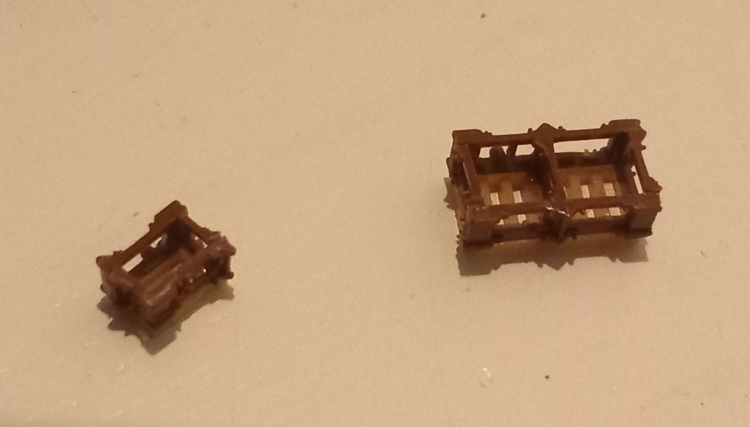 Ondertussen zijn de eerste kratjes in de maak, gemaakt van een n-spoor rongenwagen. De onderzijde daarvan had dunne rekjes dus die versneden en op een bodempje uit de rommeldoos gelijmd. Er waren zoveel soorten kratjes en rekken in die tijd dat dit prima voor flessenkratten oid door kan gaan.