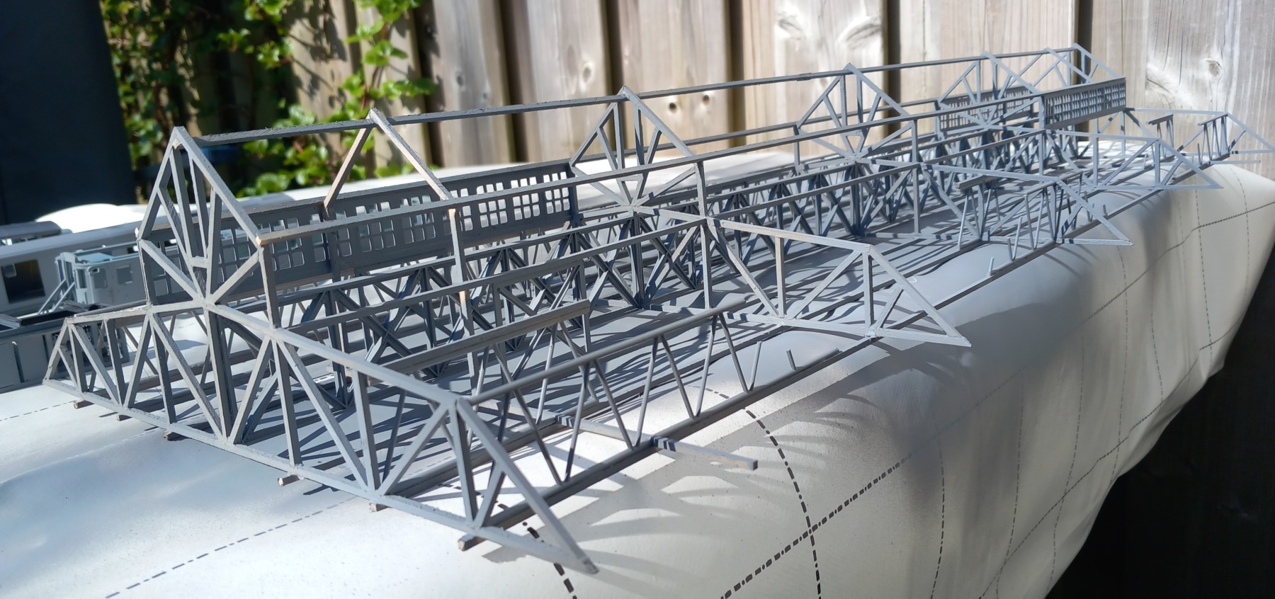 Het mooie weer van vandaag maar even benut, en met spuitbus grijze primer het dak van de Werkspoorloods gespoten. Gelijk een ander gezicht, later nog meerdere kleuren grijs nuances aanbrengen maar in ieder geval is het witte kunststof nu beter beschermt tegen verteren.