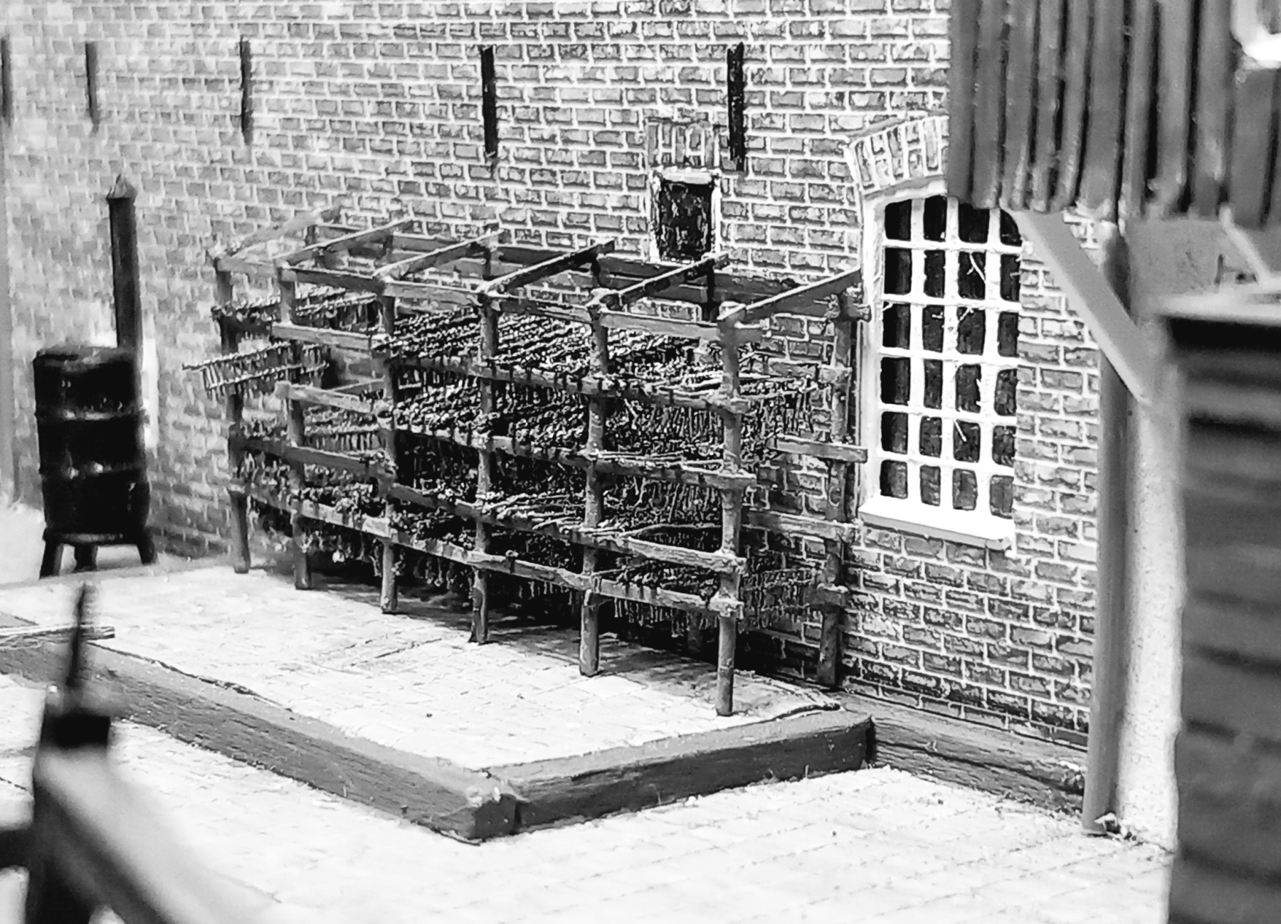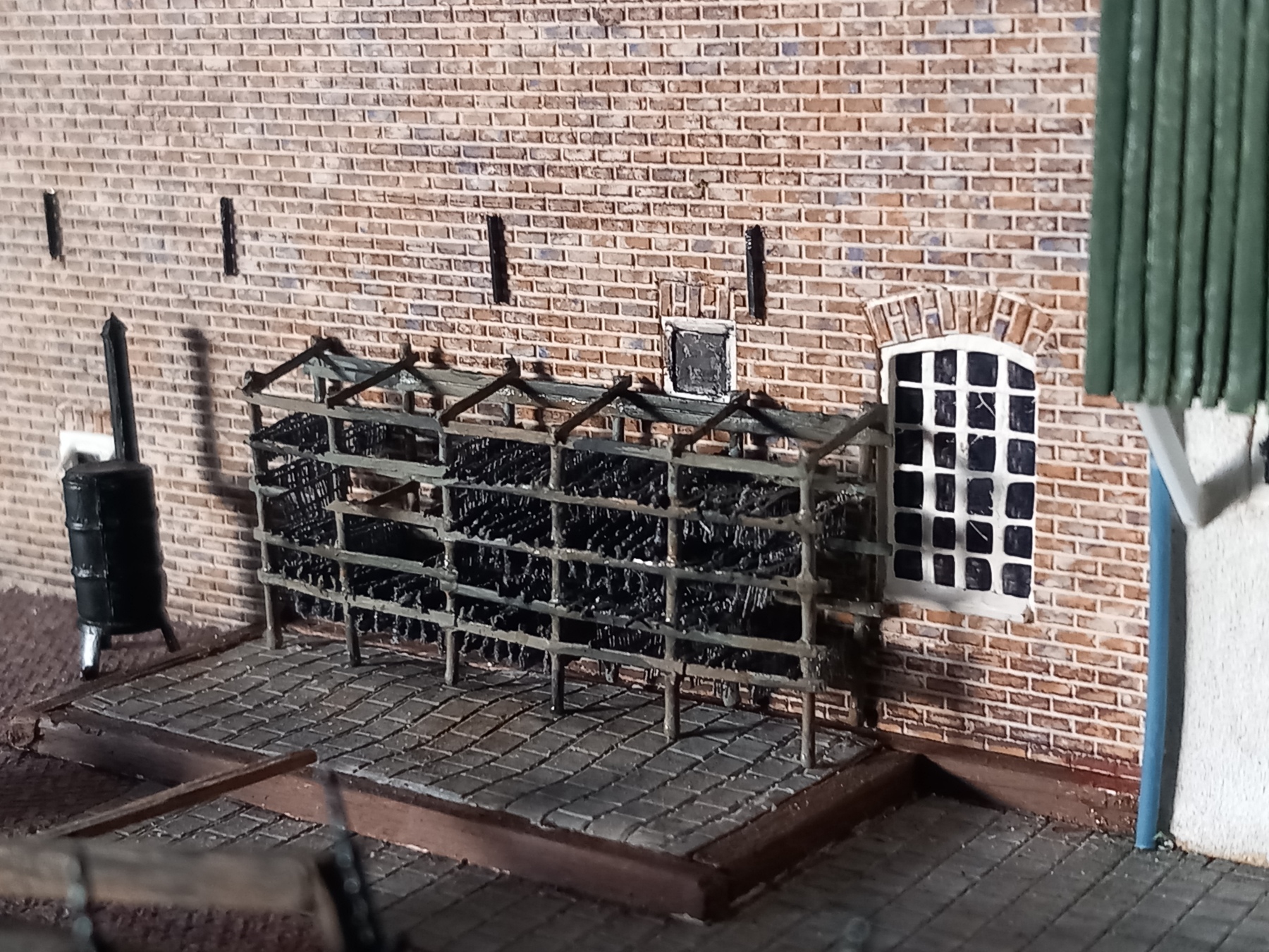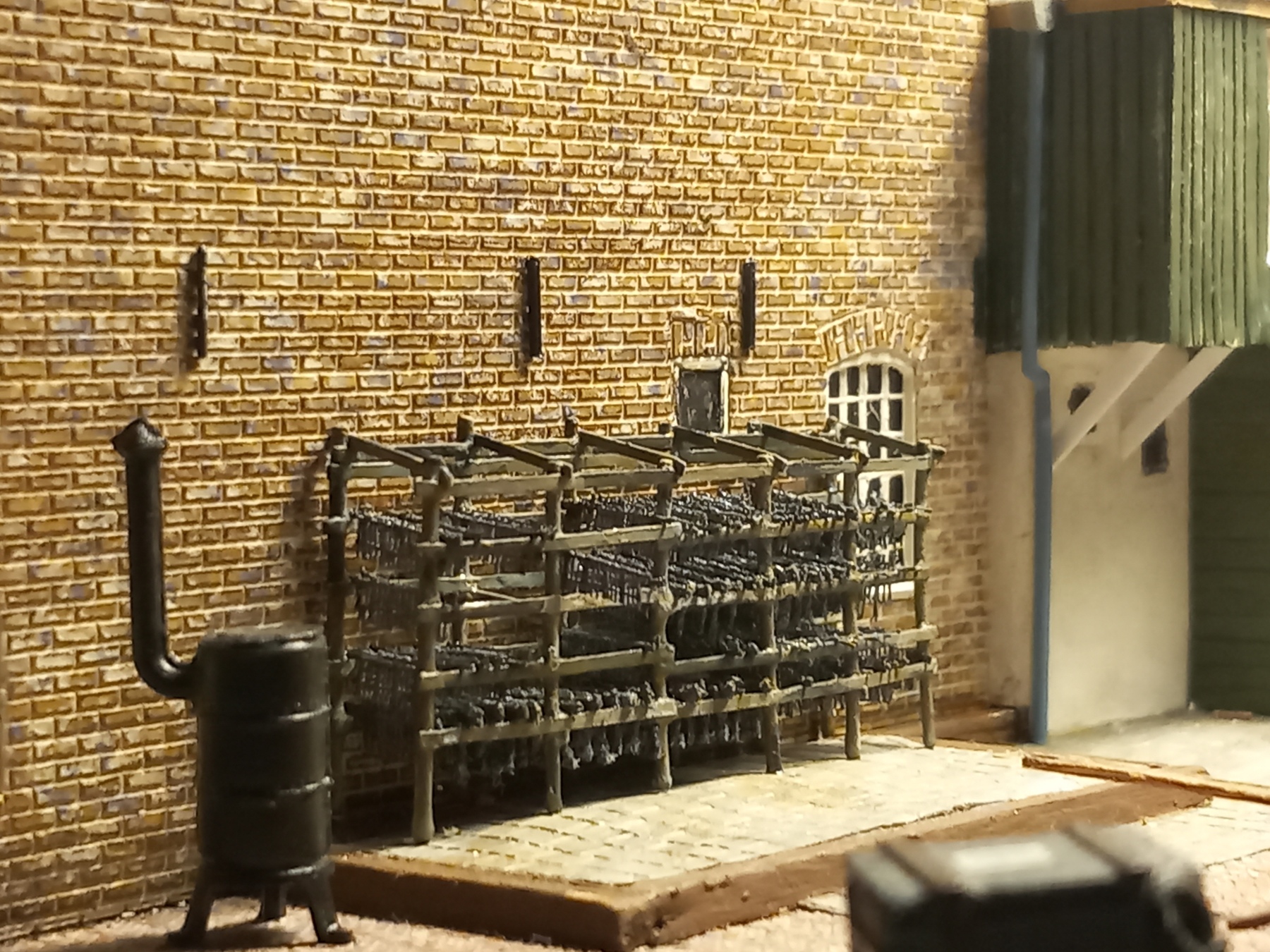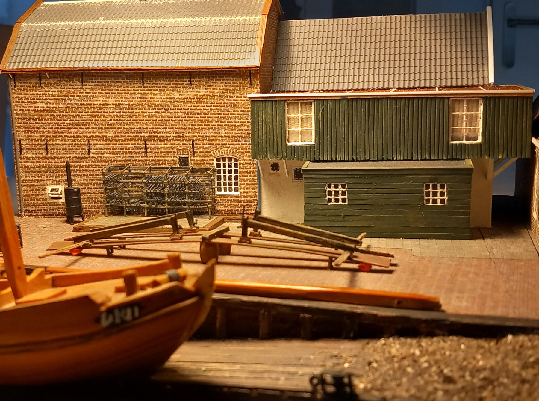 heb ik deze vishangen gemaakt. Een stuk of 80 spiesen met elk een stuk of 10 'vissen' eraan. In diverse maten en kleuren om meer soorten na te bootsen. Het rekje was ik eerder al aan begonnen, maar die is nu eindelijk klaar. Bij gebrek aan horrengaas voor alle vissen, de rest uit dun kant gemaakt wat ik normaal voor de raampjes doe als vitrage. Dat was iets grover dan het horrengaas en geeft meteen iets dikkere vissen dan de eerste serie van ijzerdraadspiezen met horrengaas vissen. De plaatsing op de werf is fictief, het plaatsje waar ik hem opgezet heb, kwam van oude tekeningen waar na een verbouwing later een aanbouw op foto's te zien is. Maar ik wilde een vroege uitvoering van de werf dus zonder deze uitbouw. Maar had het plaatsje al op de grondplaat aangebracht. Dat was nu een mooi plekje voor de vishangen, compleet met rookoventje ernaast.