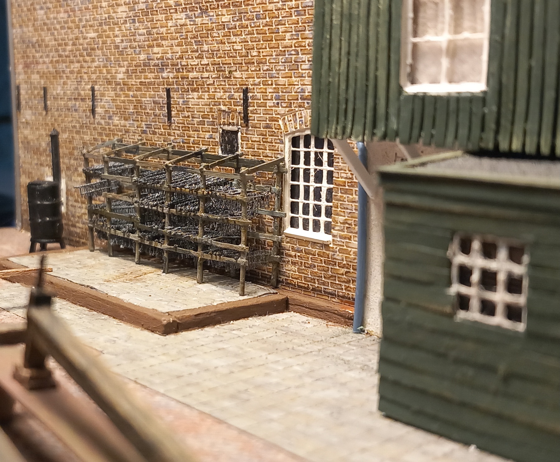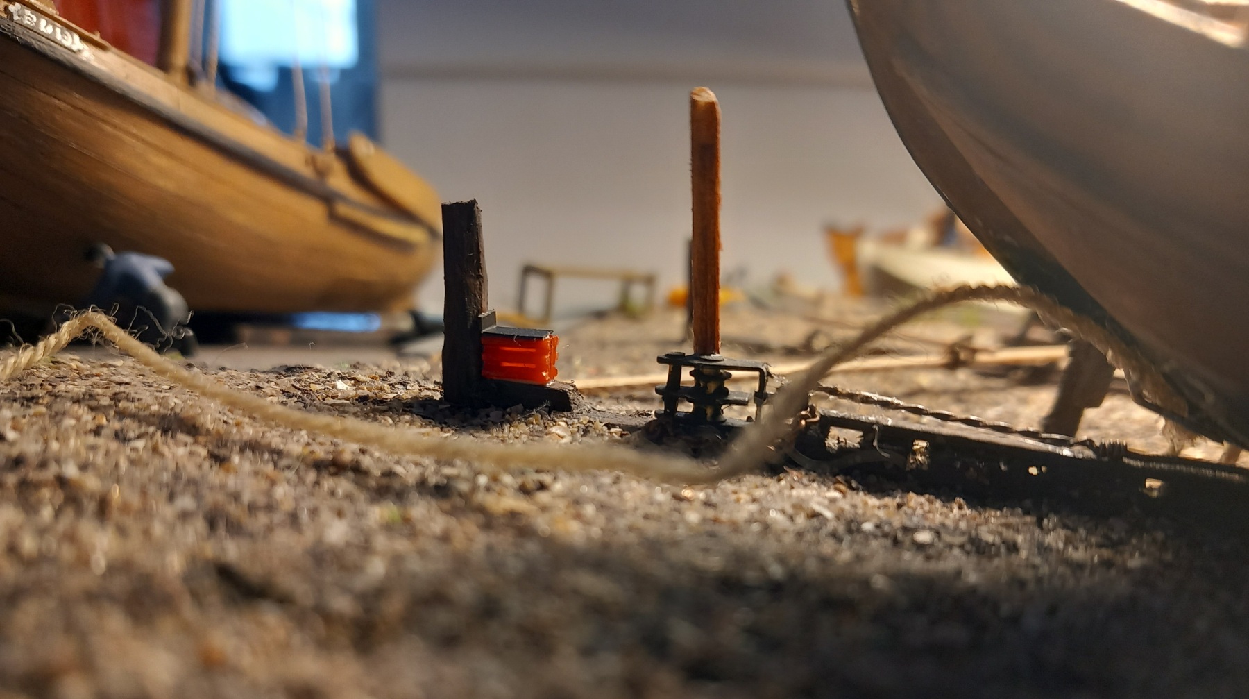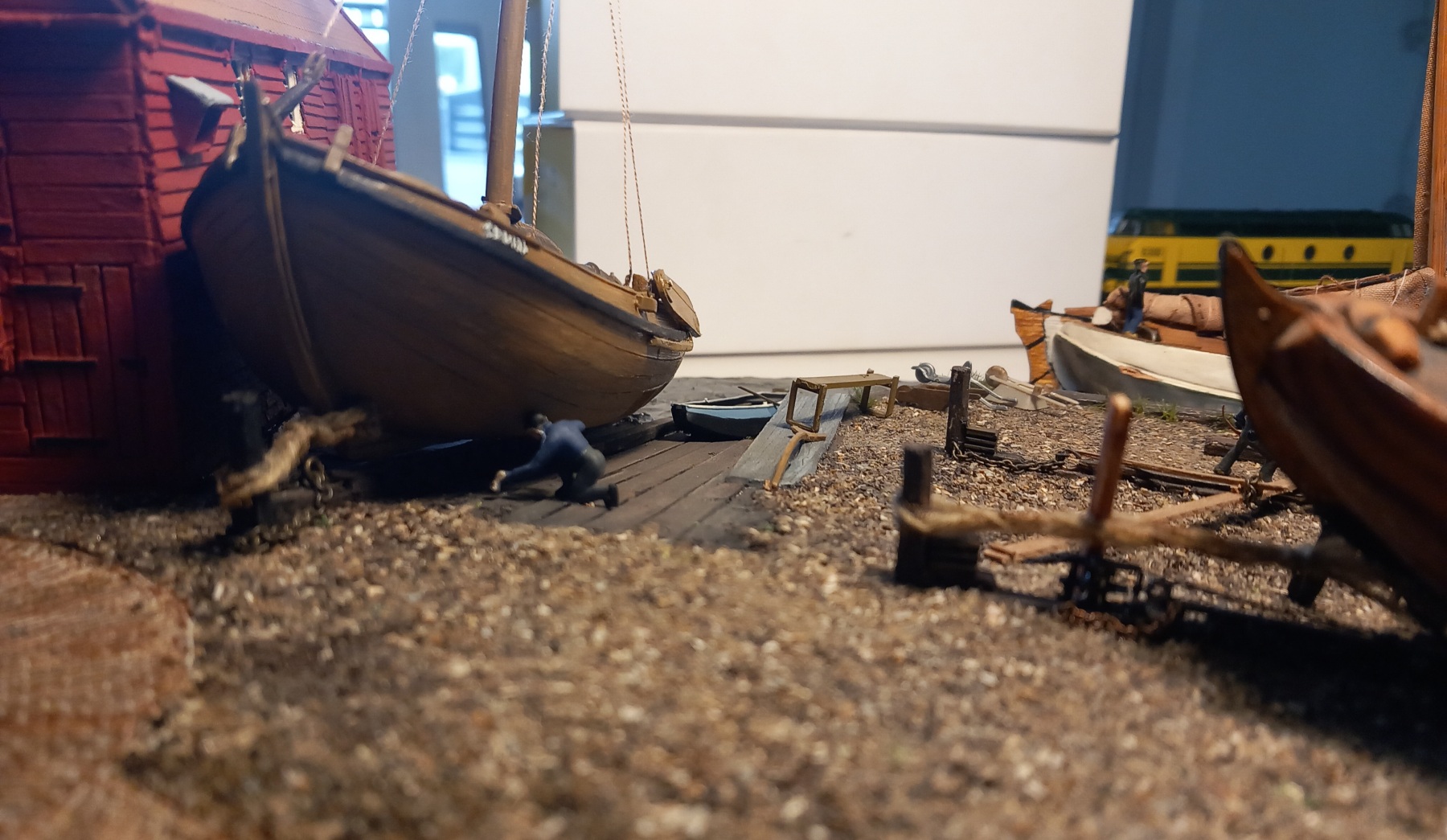 heb ik deze vishangen gemaakt. Een stuk of 80 spiesen met elk een stuk of 10 'vissen' eraan. In diverse maten en kleuren om meer soorten na te bootsen. Het rekje was ik eerder al aan begonnen, maar die is nu eindelijk klaar. Bij gebrek aan horrengaas voor alle vissen, de rest uit dun kant gemaakt wat ik normaal voor de raampjes doe als vitrage. Dat was iets grover dan het horrengaas en geeft meteen iets dikkere vissen dan de eerste serie van ijzerdraadspiezen met horrengaas vissen. De plaatsing op de werf is fictief, het plaatsje waar ik hem opgezet heb, kwam van oude tekeningen waar na een verbouwing later een aanbouw op foto's te zien is. Maar ik wilde een vroege uitvoering van de werf dus zonder deze uitbouw. Maar had het plaatsje al op de grondplaat aangebracht. Dat was nu een mooi plekje voor de vishangen, compleet met rookoventje ernaast.