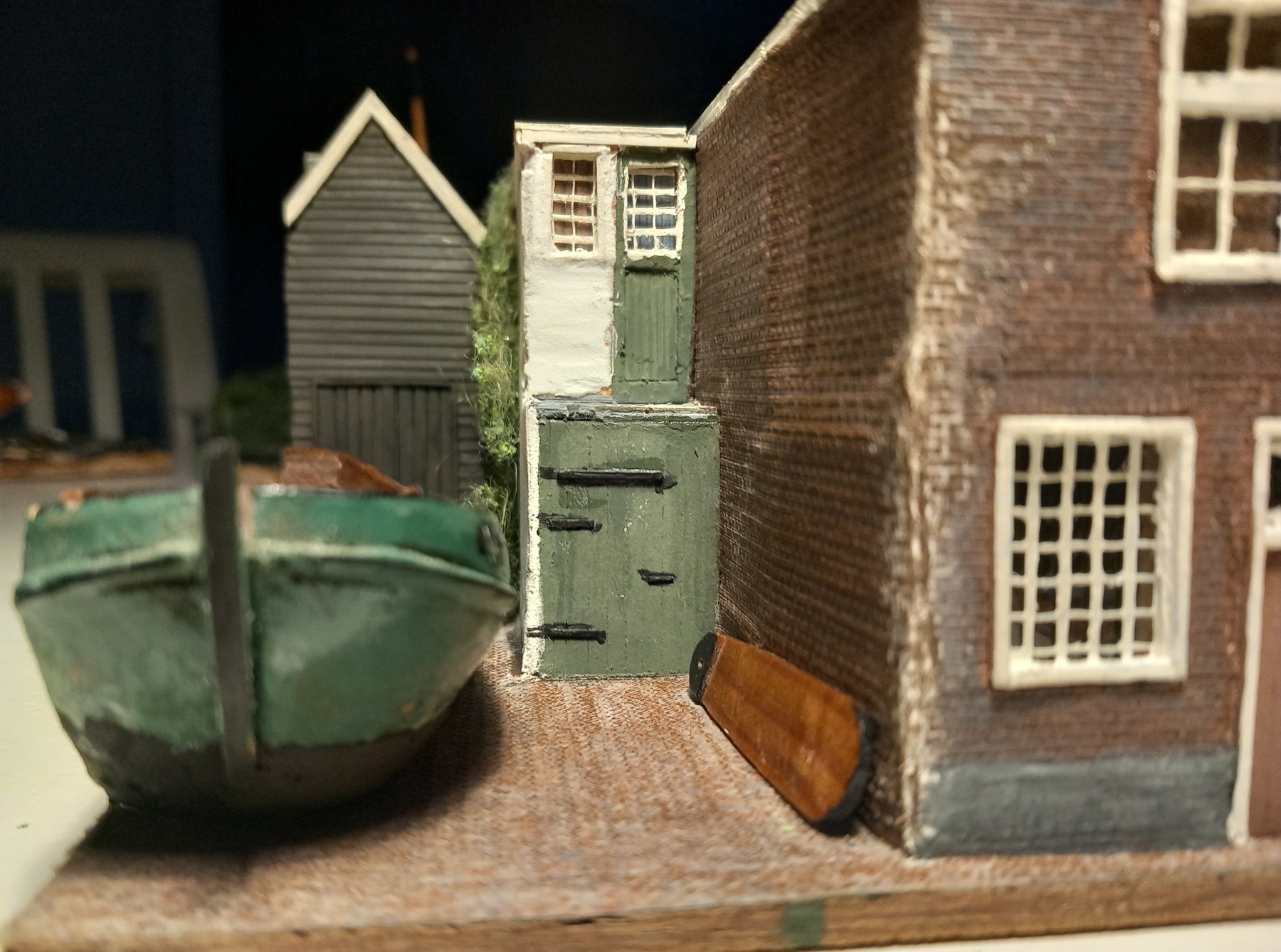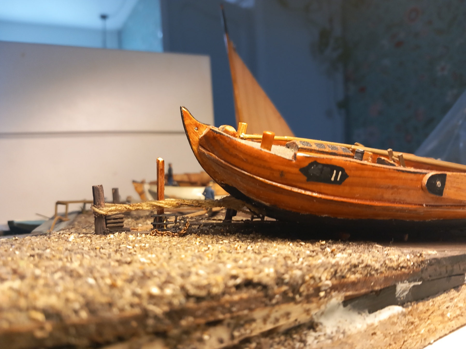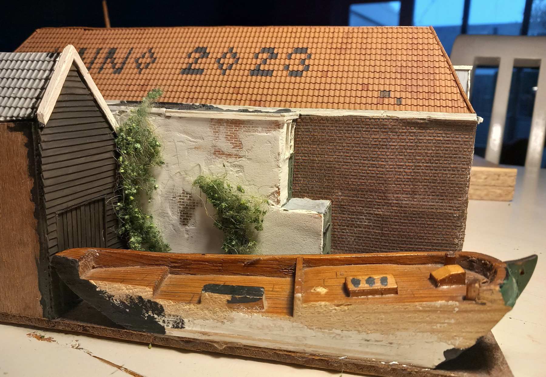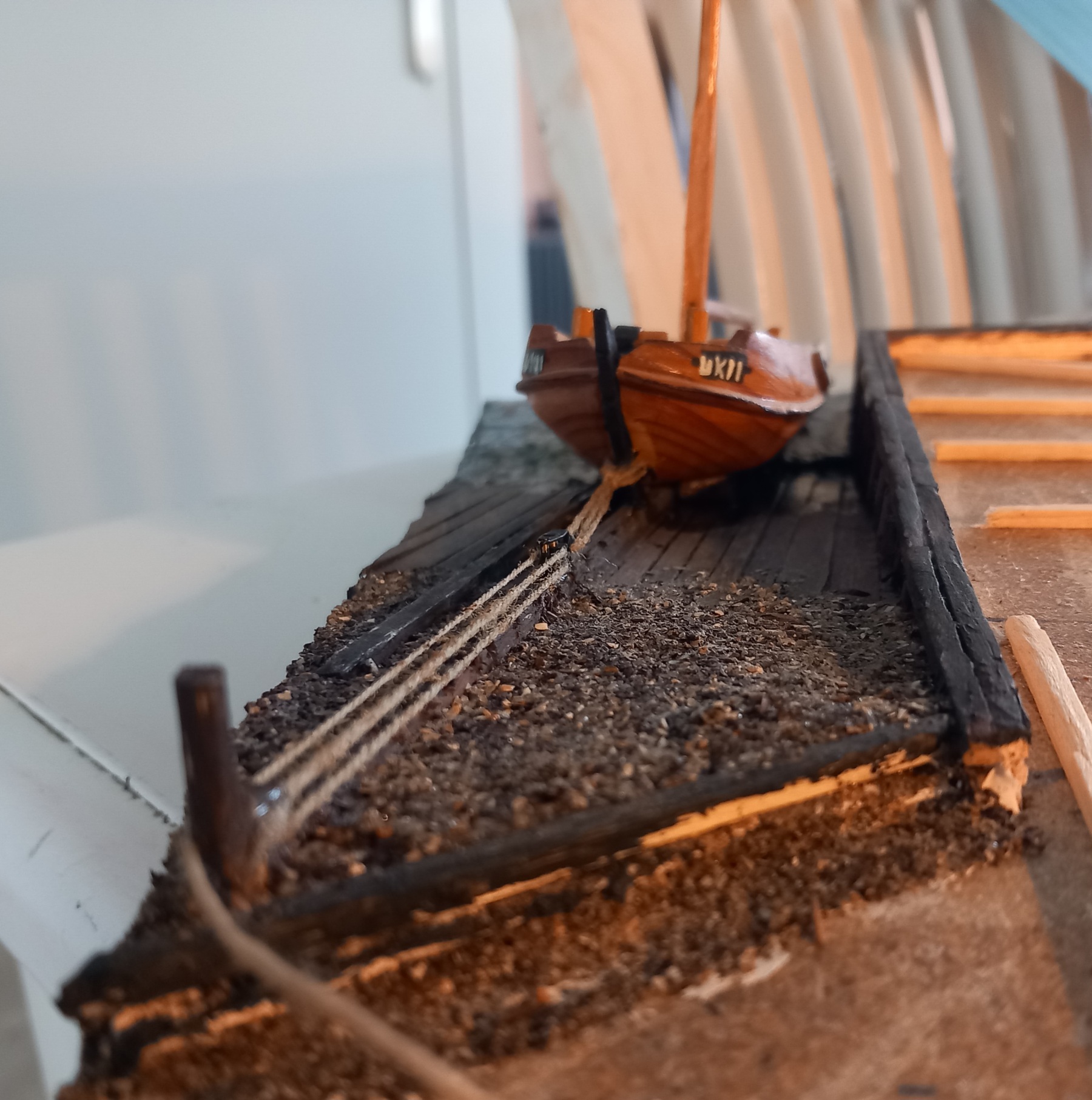 heb ik deze vishangen gemaakt. Een stuk of 80 spiesen met elk een stuk of 10 'vissen' eraan. In diverse maten en kleuren om meer soorten na te bootsen. Het rekje was ik eerder al aan begonnen, maar die is nu eindelijk klaar. Bij gebrek aan horrengaas voor alle vissen, de rest uit dun kant gemaakt wat ik normaal voor de raampjes doe als vitrage. Dat was iets grover dan het horrengaas en geeft meteen iets dikkere vissen dan de eerste serie van ijzerdraadspiezen met horrengaas vissen. De plaatsing op de werf is fictief, het plaatsje waar ik hem opgezet heb, kwam van oude tekeningen waar na een verbouwing later een aanbouw op foto's te zien is. Maar ik wilde een vroege uitvoering van de werf dus zonder deze uitbouw. Maar had het plaatsje al op de grondplaat aangebracht. Dat was nu een mooi plekje voor de vishangen, compleet met rookoventje ernaast.
