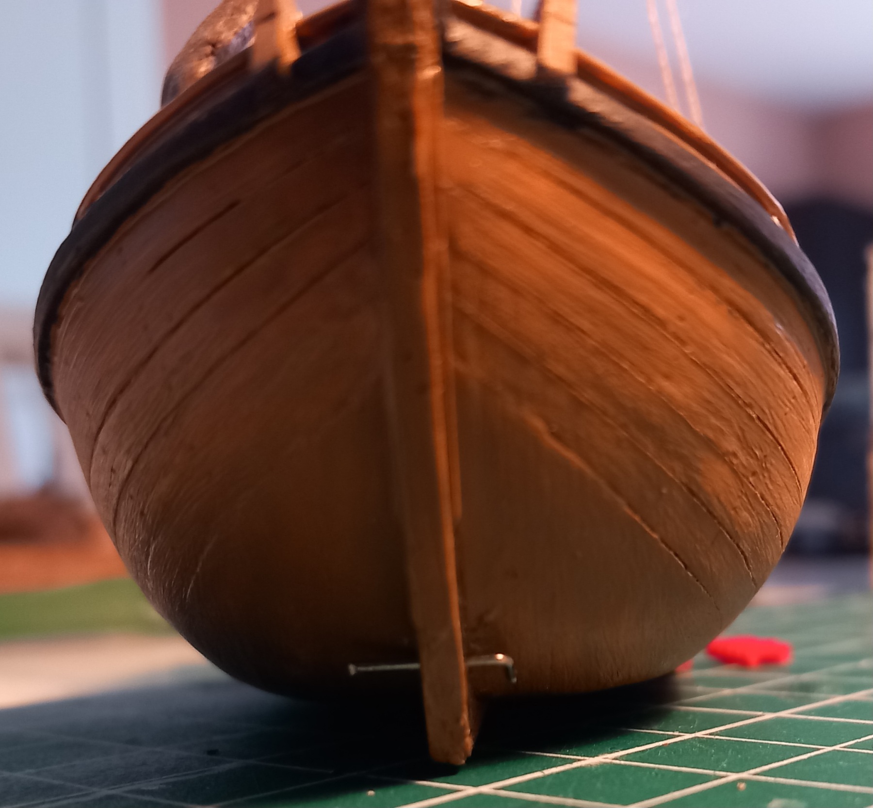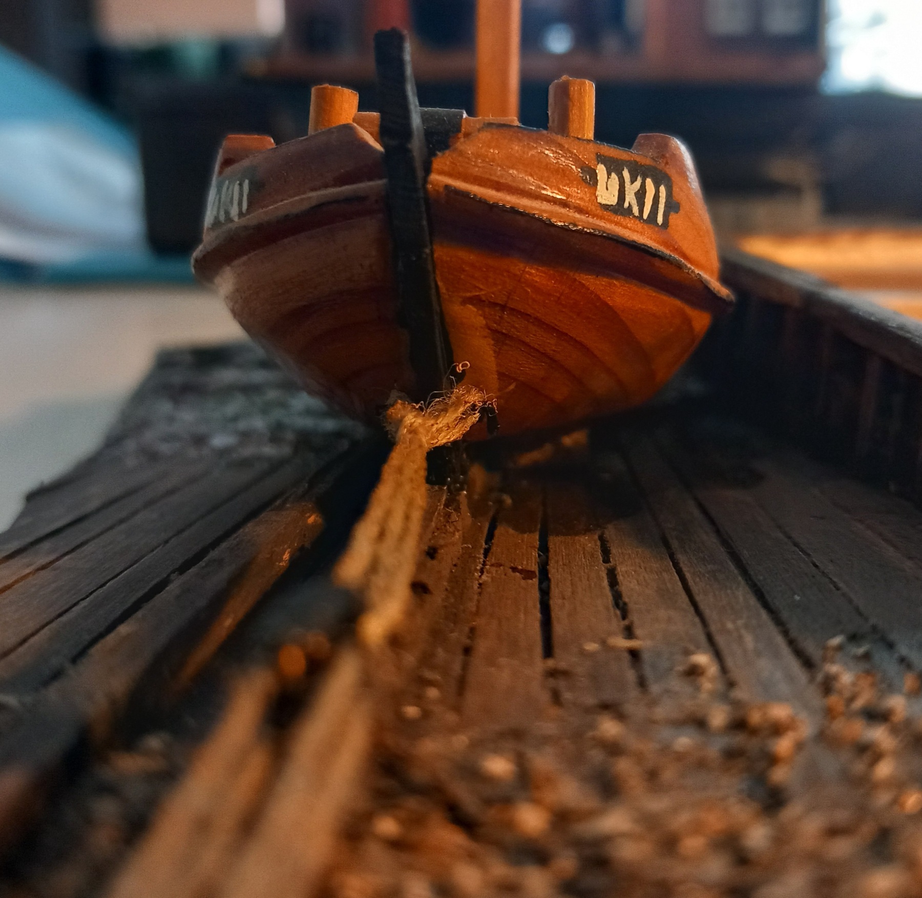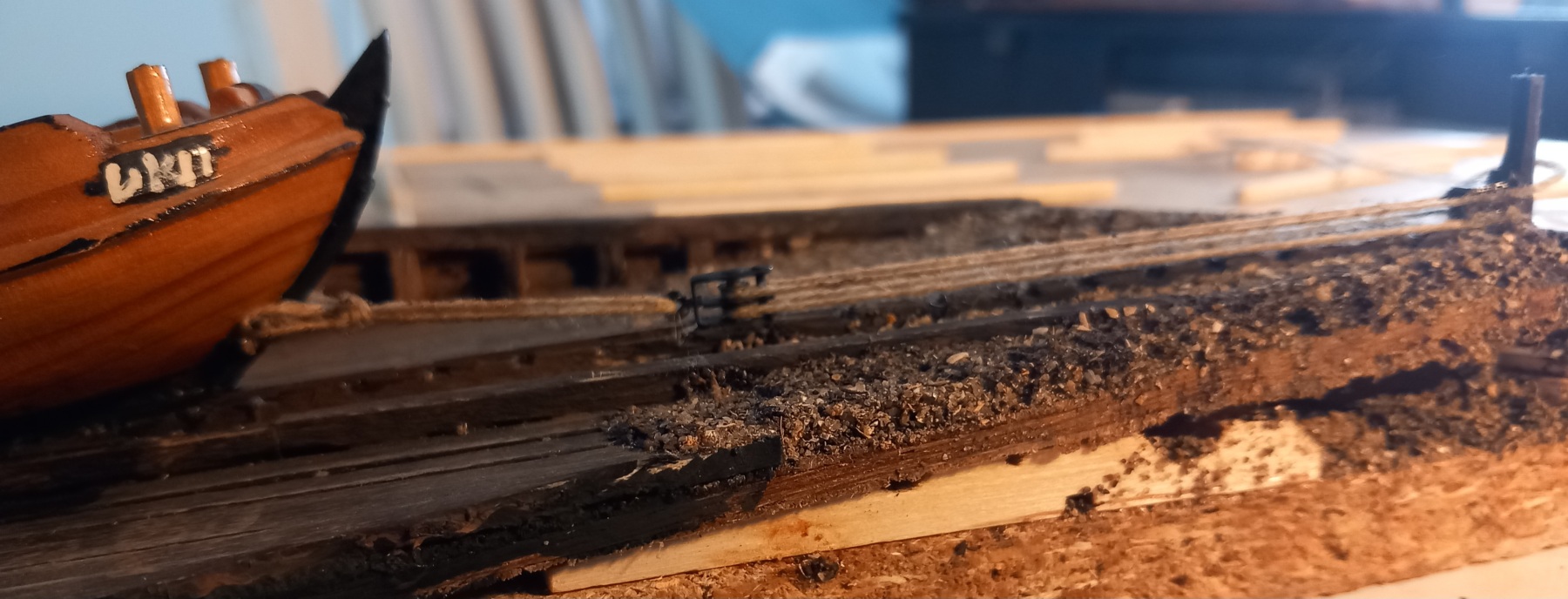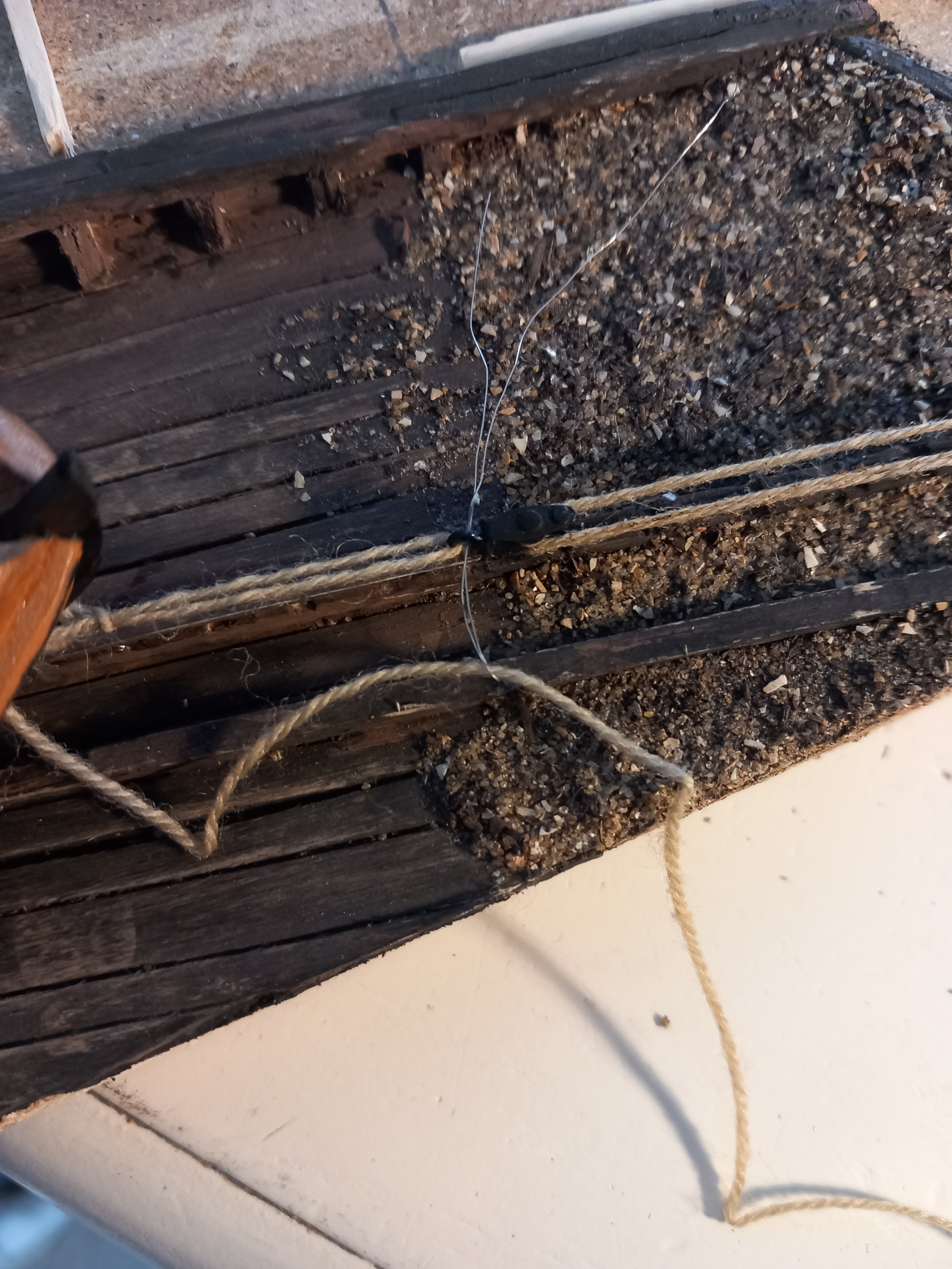 Gister wat touwen en tuidraden door de katrollen getrokken. Nog wat schilderklusjes en potloodverwering gedaan. Niet van alles foto's maar wel van de touwen en tuidraden, tevens van restjes rood hekwerk wat imitatie katrollen gemaakt en daarna op kleur gebracht. De haak in de boeg is van een oude knopspeld, conform het grote voorbeeld werden de touwen aan zo'n haak in de boeg gedaan. De touwen door de gaatjes krijgen viel niet mee, maar met behulp van een dun ijzerdraadje toch gelukt.