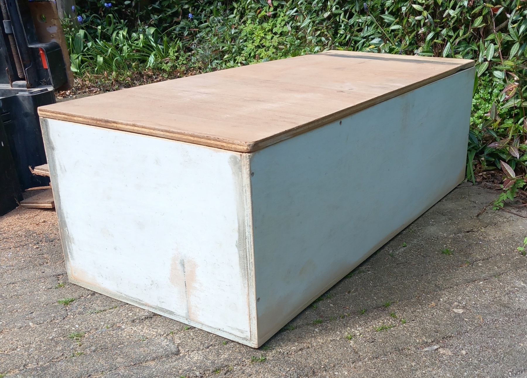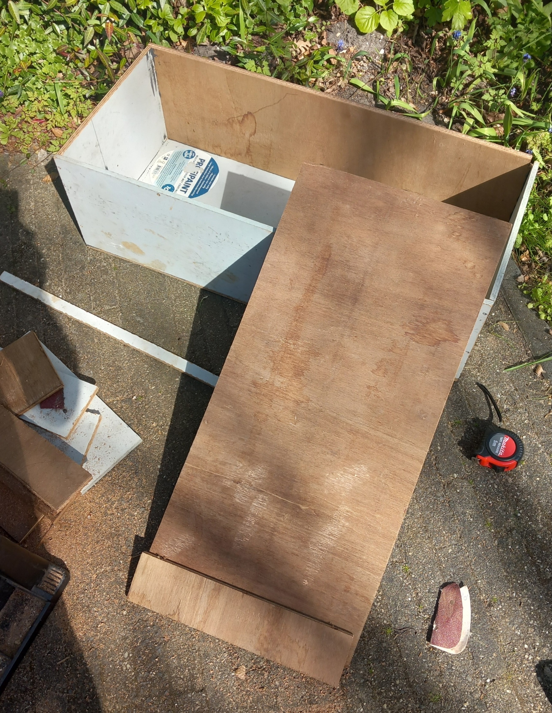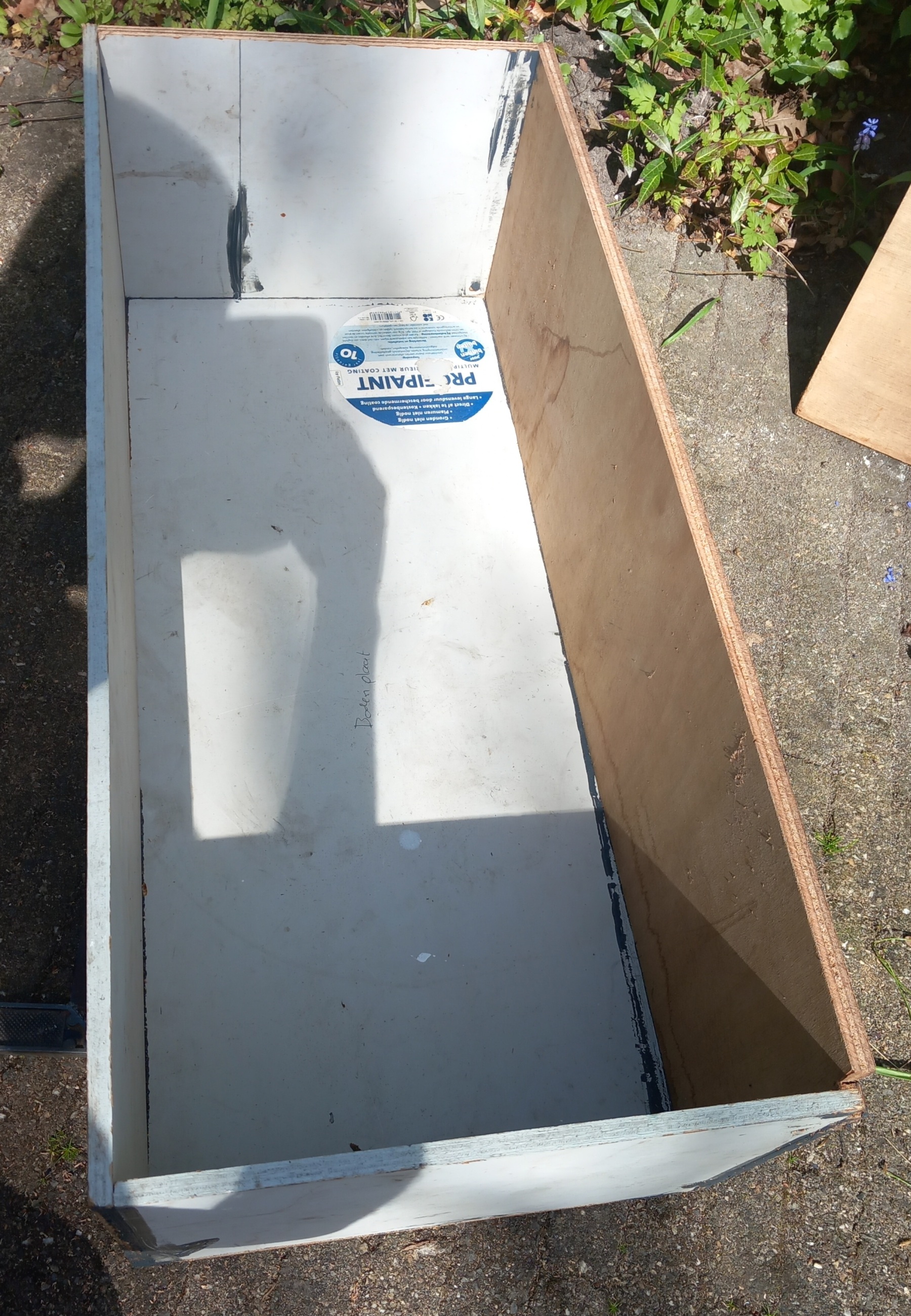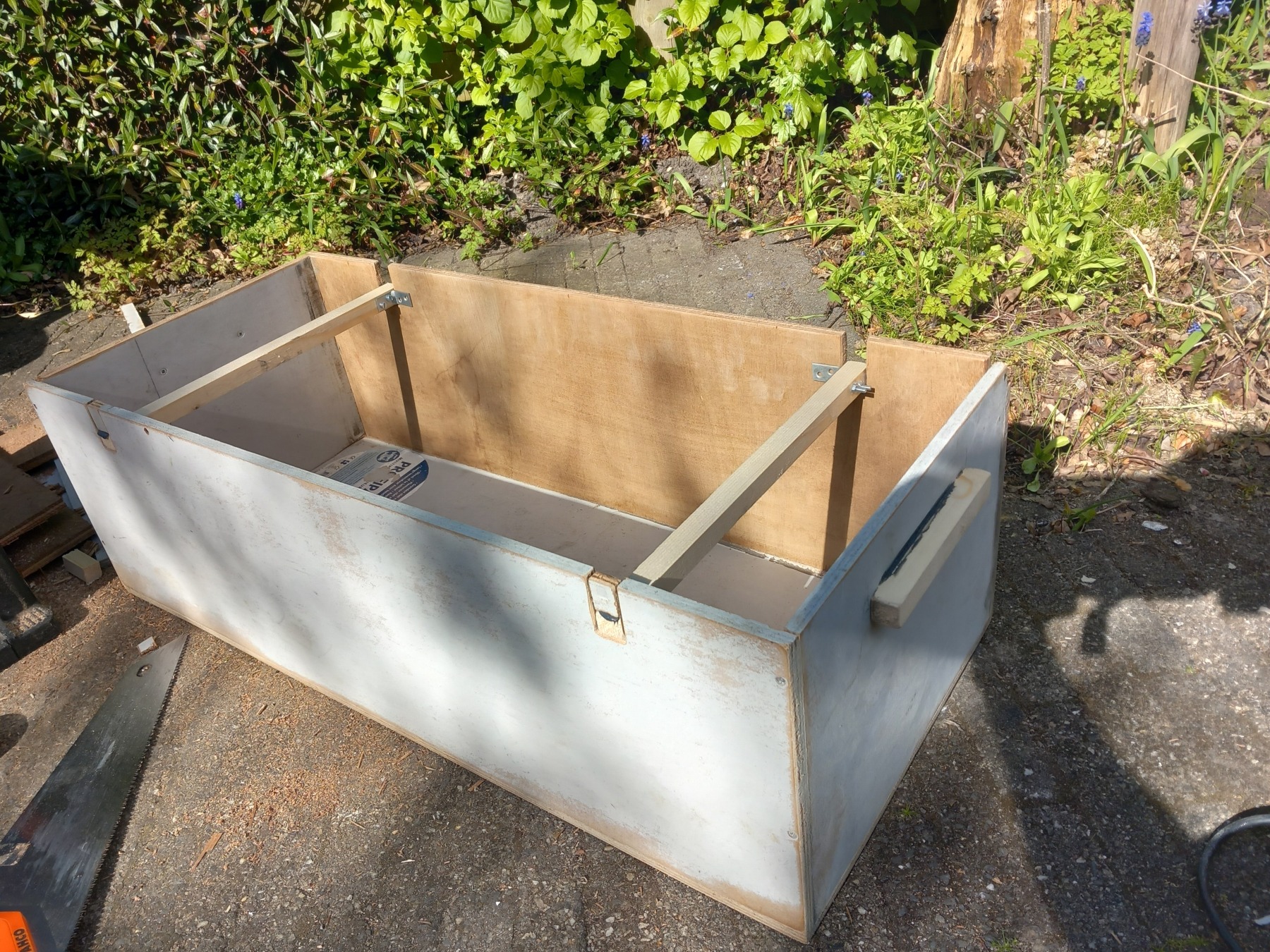 Ondertussen de kist weer wat verder, handgrepen erop en los uitneembare balkjes waar de loods op kan staan mocht 'ie een keer wat hoger moeten. Dat ziet er dan nu zo uit: