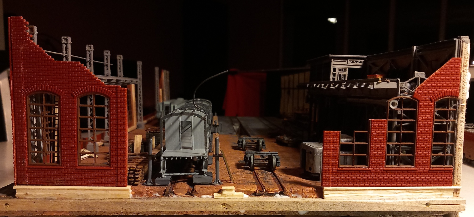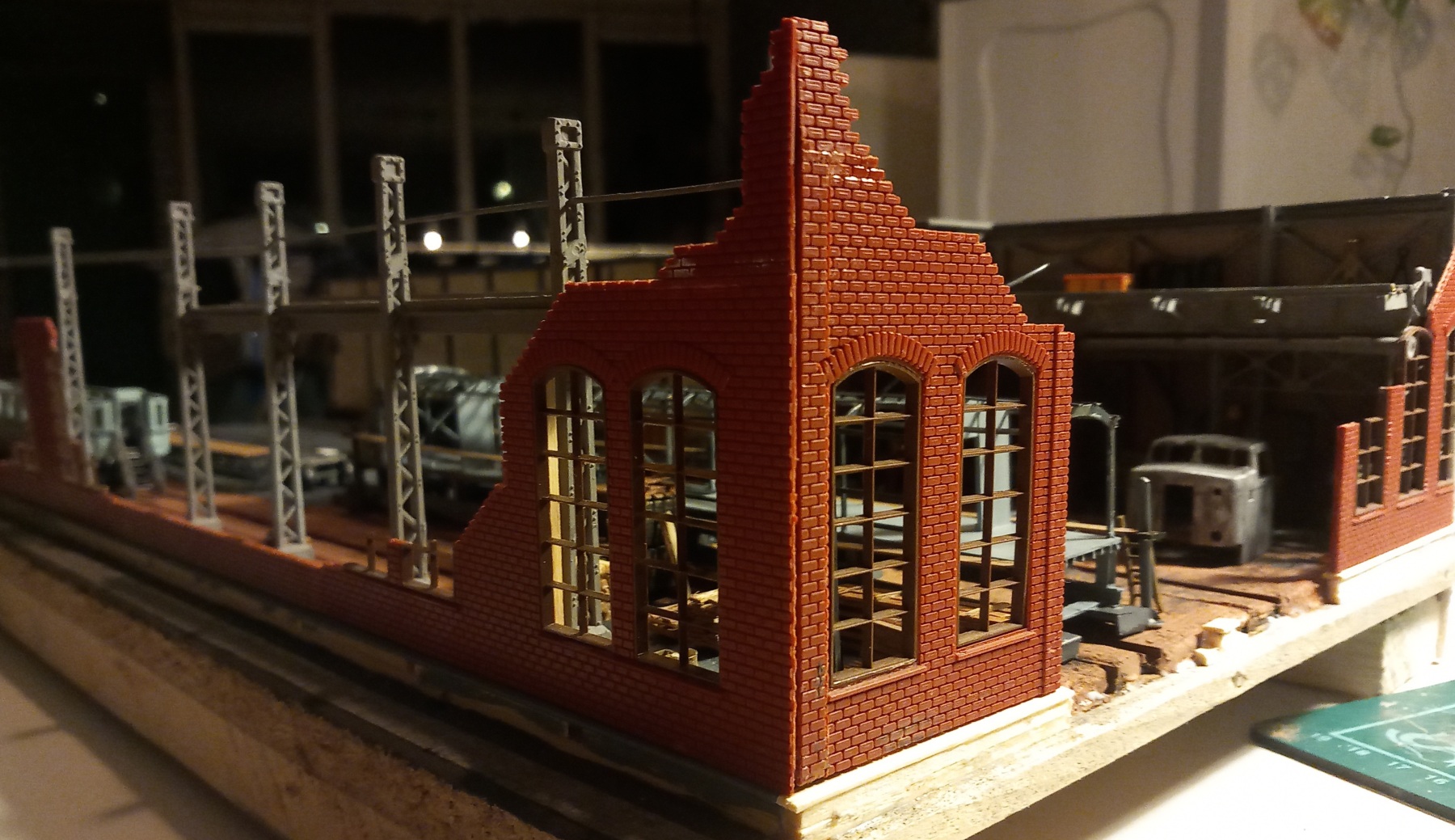 Het rechtse deel moeten de bakstenen nog uitgehakt en moet ook nog wat hoger worden. Er komen ook halve deuren tussen. De andere zijde komen 4 deuren, daar liggen ook 4 sporen tot vooraan. En dan kan aan die kant de 30cm uitbreiding later. De zijde waar ik nu mee bezig ben, wil ik miss ooit nog een kleine rolbrug met wat groen.