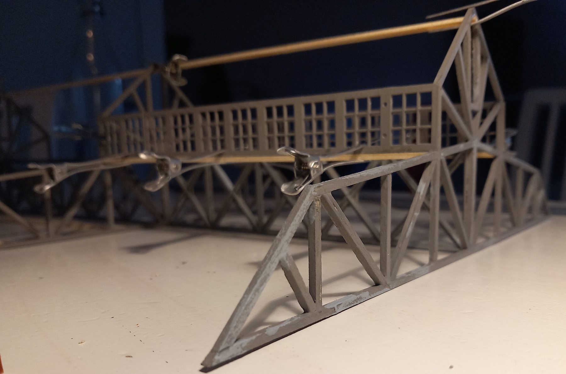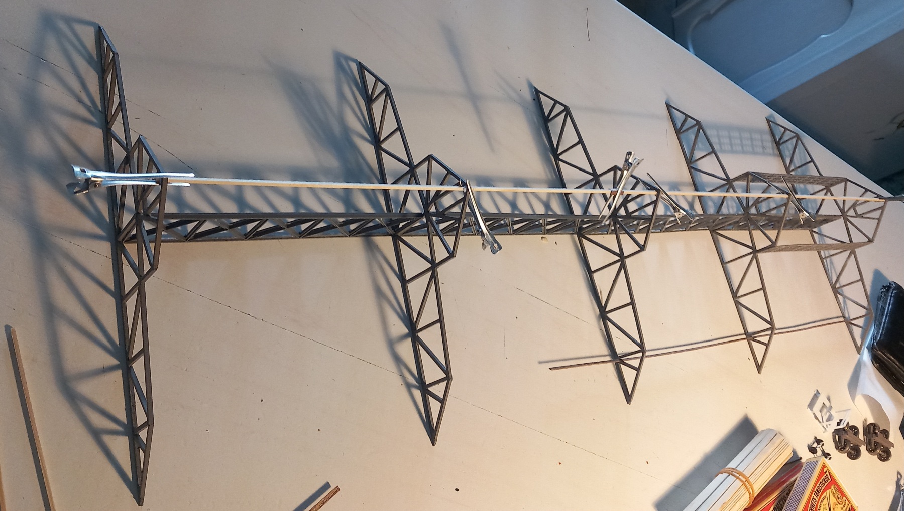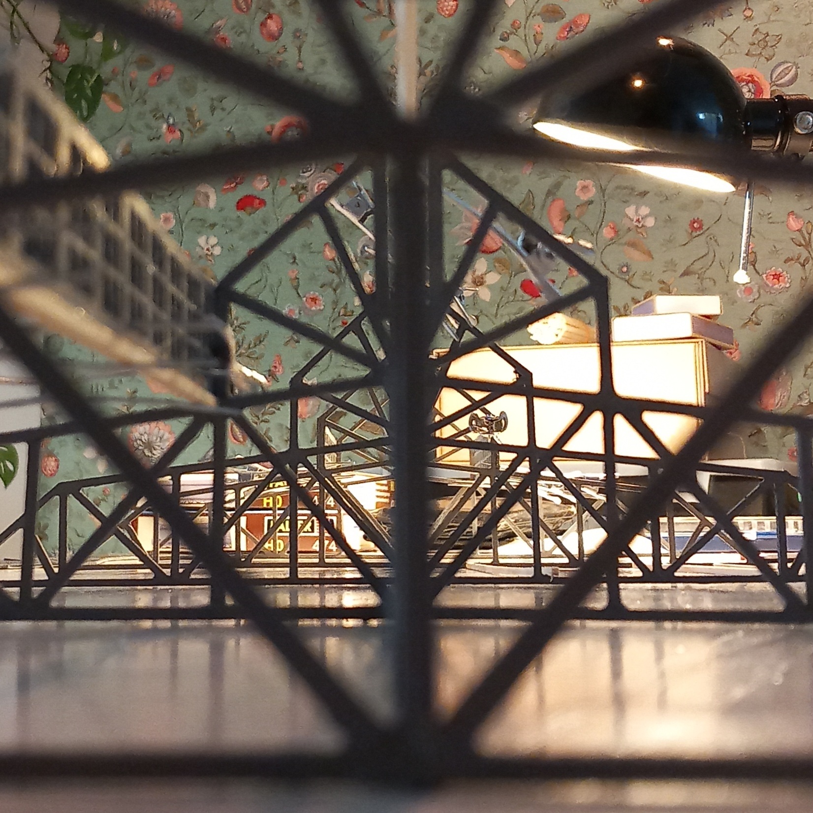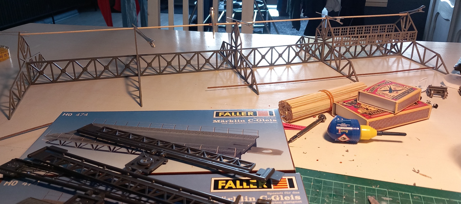 De doosjes op de voorgrond zijn 2 setjes Faller 474, kwam ze op mp tegen en de spanten van deze bruggen worden de basis van de eerste bovenloopkraan, die boven de hondekop. Kitbashing nr zoveel in de loods