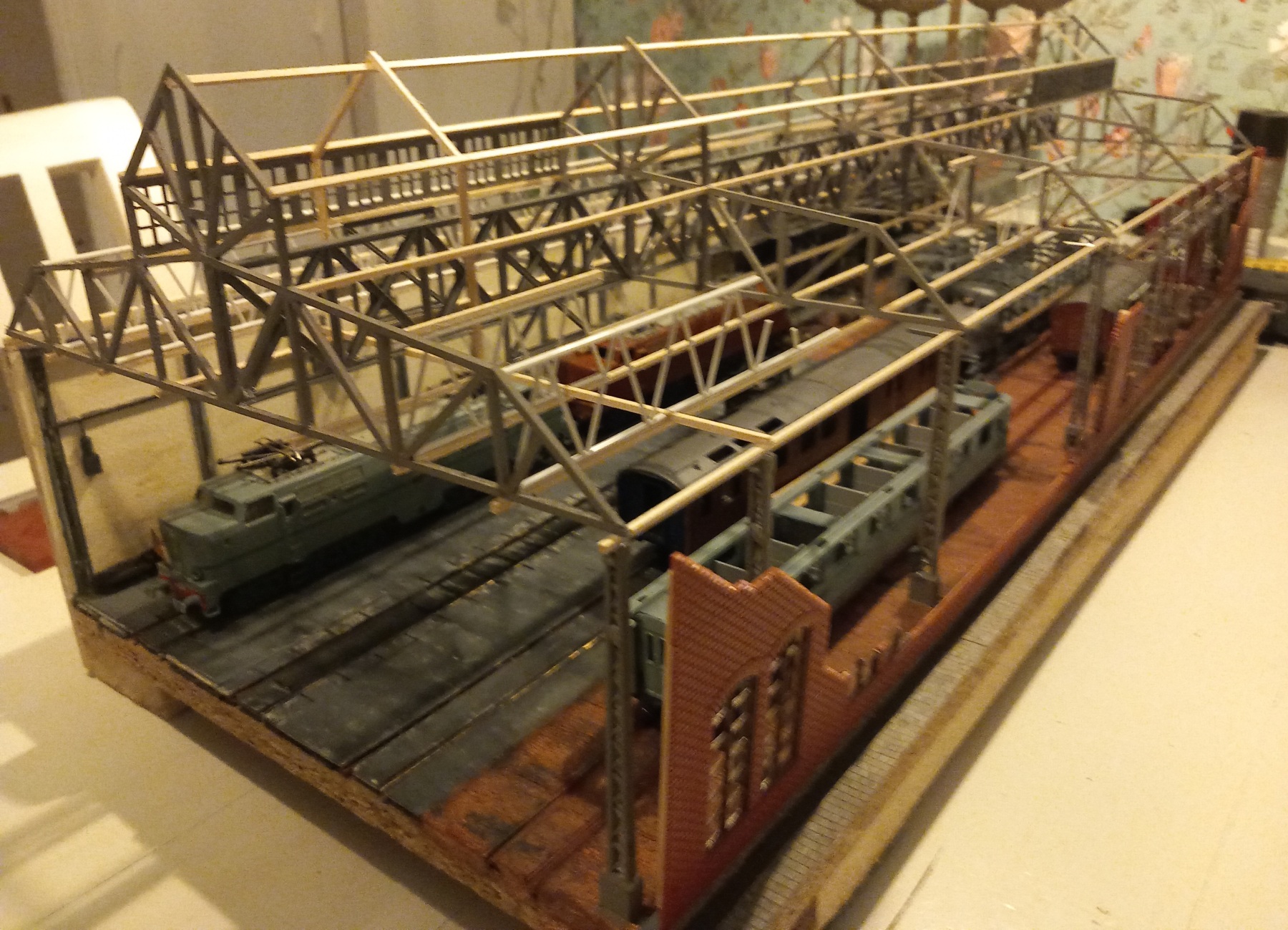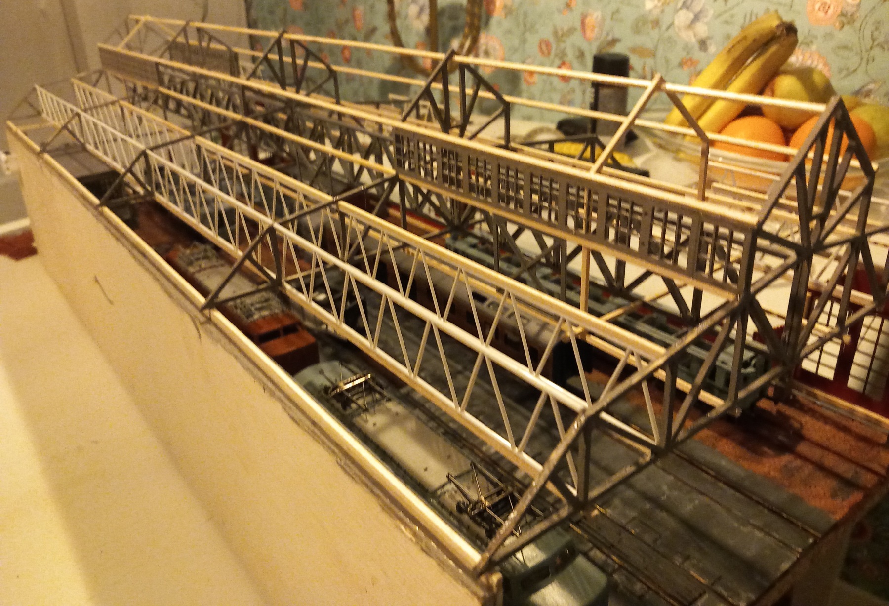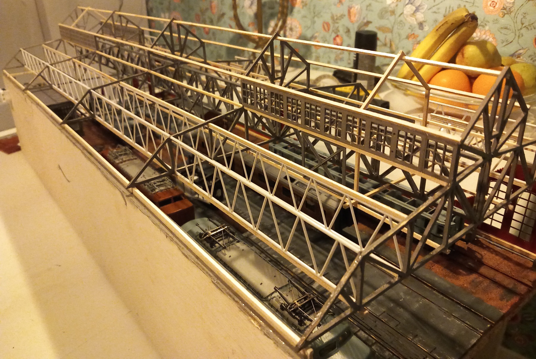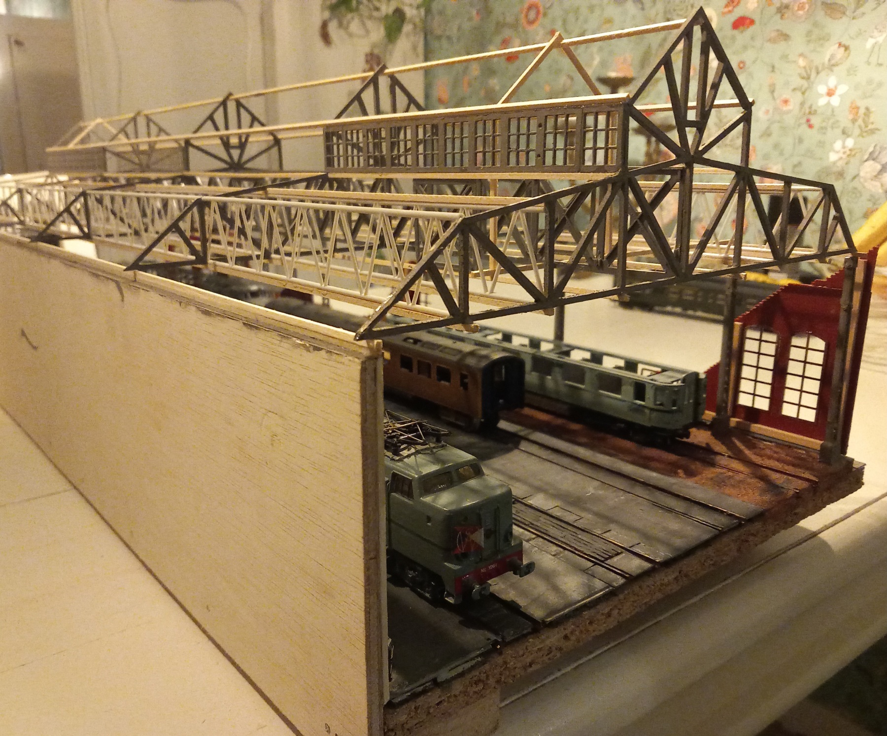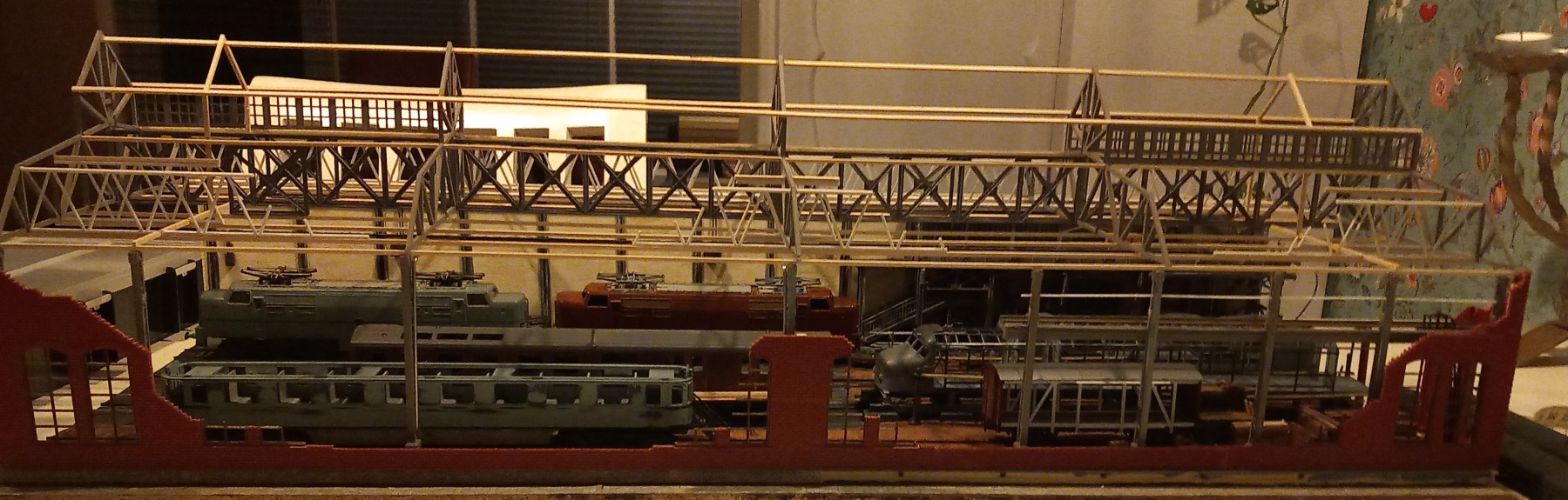 En voor de dakspanten zou ik styreen gebruiken voor de stijve verbindingen. Wellicht afgewisseld met houten spanten die je met 'dilataties' (kleine ruimtes) aanbrengt voor het zicht, maar niet voor de dragende constructie.