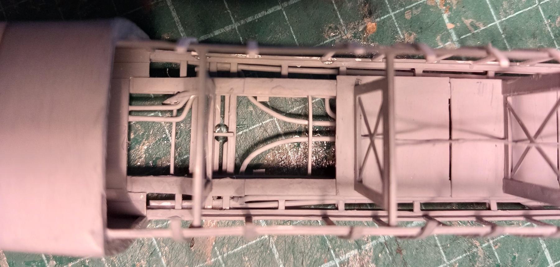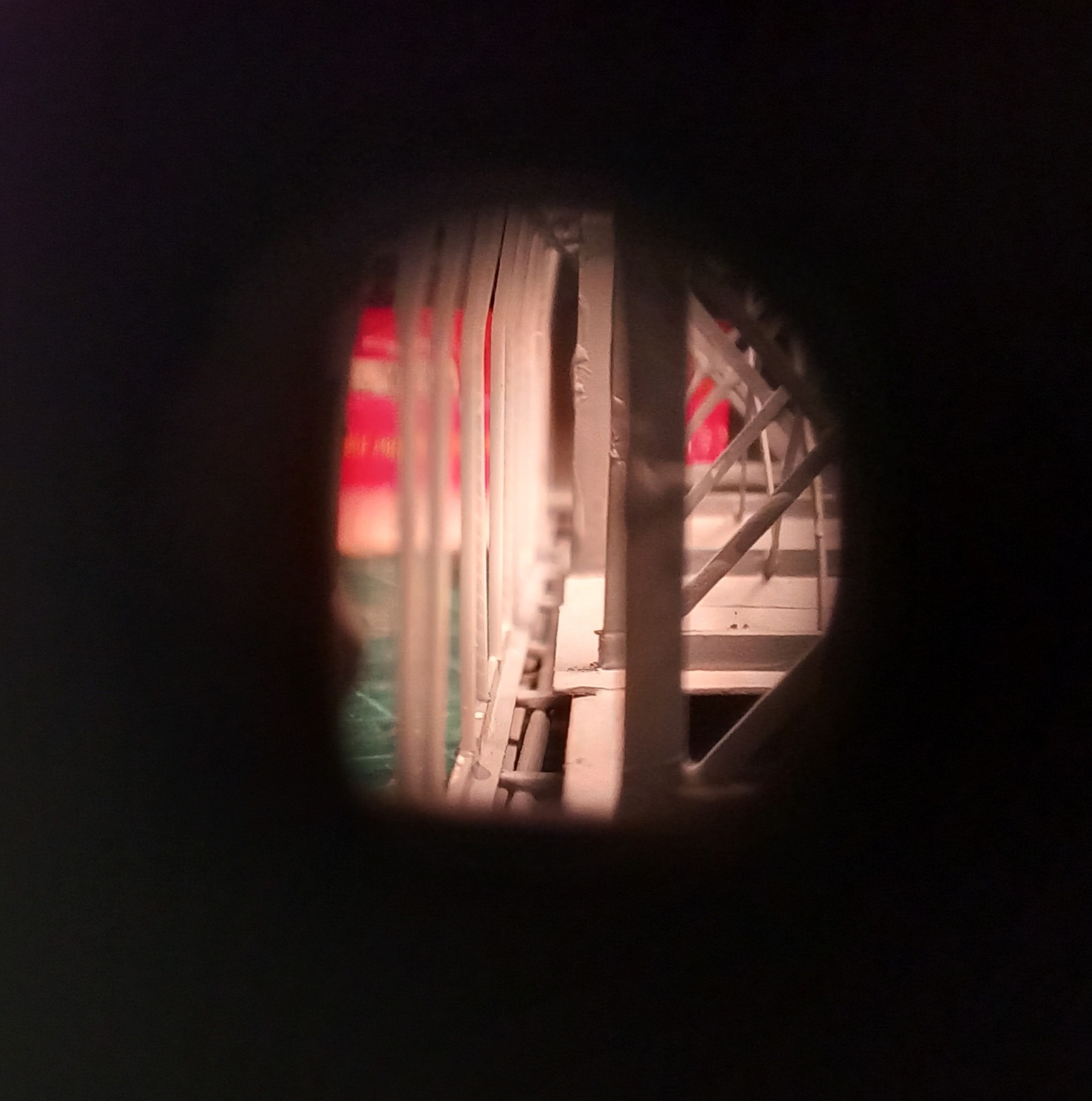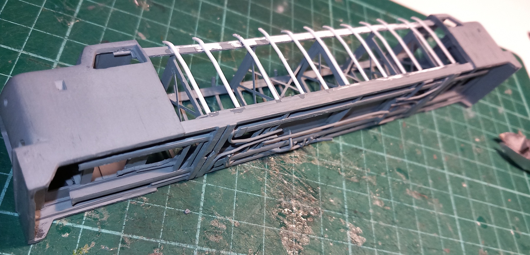 Af en toe ook eens wat afmaken, na bijna een jaar de laatste ribben op de 1200 in ruwbouw kunnen zetten. Onlangs de ontbrekende evergreen strippen kunnen halen. De opnames met de kleine rondjes zijn door de bovenste frontlichten, en daardoor is goed het gangpad te zien dat langs de apparatenkasten liep.