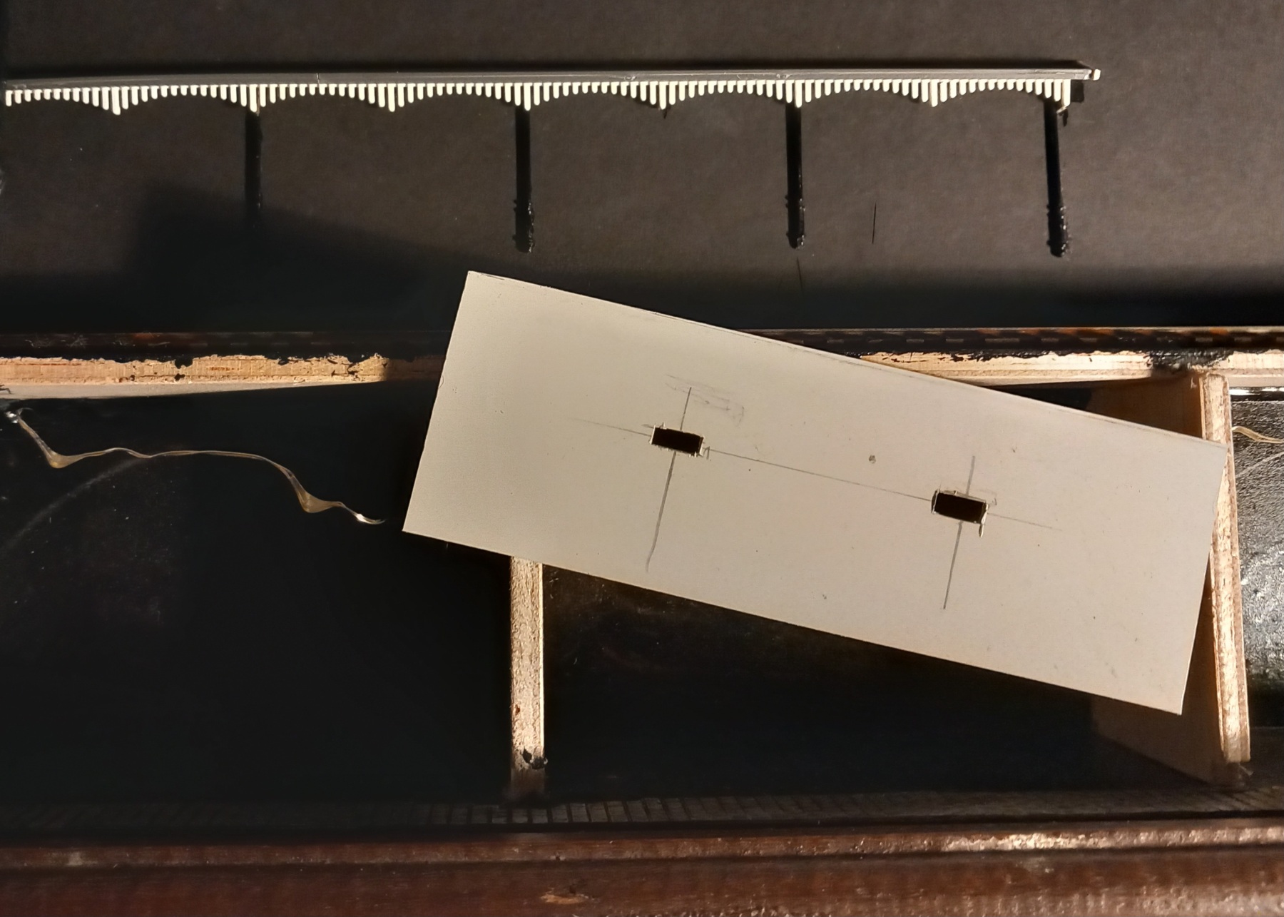 Daarnaast van restant van hekjes waar ik de brugroosters van gemaakt heb, een perronoverkapping aan het maken voor bij de blokkendoos. Dit wordt een perronoverkapping van slechts 1cm breed en komt tegen de achterwand van de houten lijst.