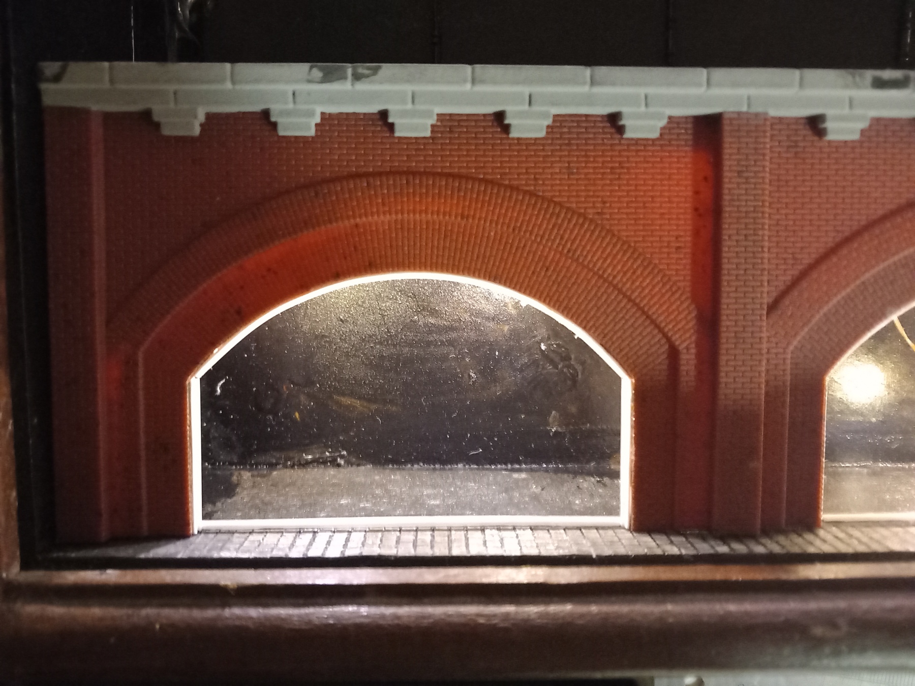 ) gat erin gesneden, lampjes gefixeerd met secondelijm en na droging afgekit met antraciete polymax want dat was over van een 1:1 klus. Die lijm heb ik ook de stenen mee gelijmd en randen mee afgekit in de lijst, tegen het doorlekken van de verlichting bij o.a. de rails die boven de winkeltjes loopt.