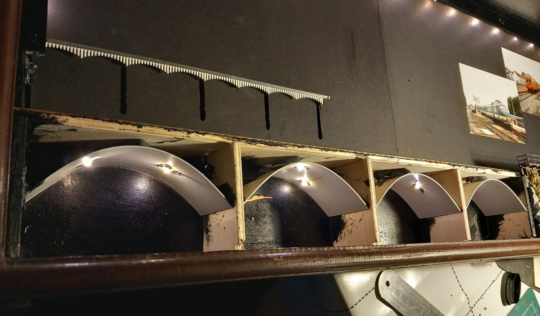 Ondertussen de perronoverkapping op zijn plek. Toevallig komen de bogen precies overeen met de dakventilators van de mat '24.
