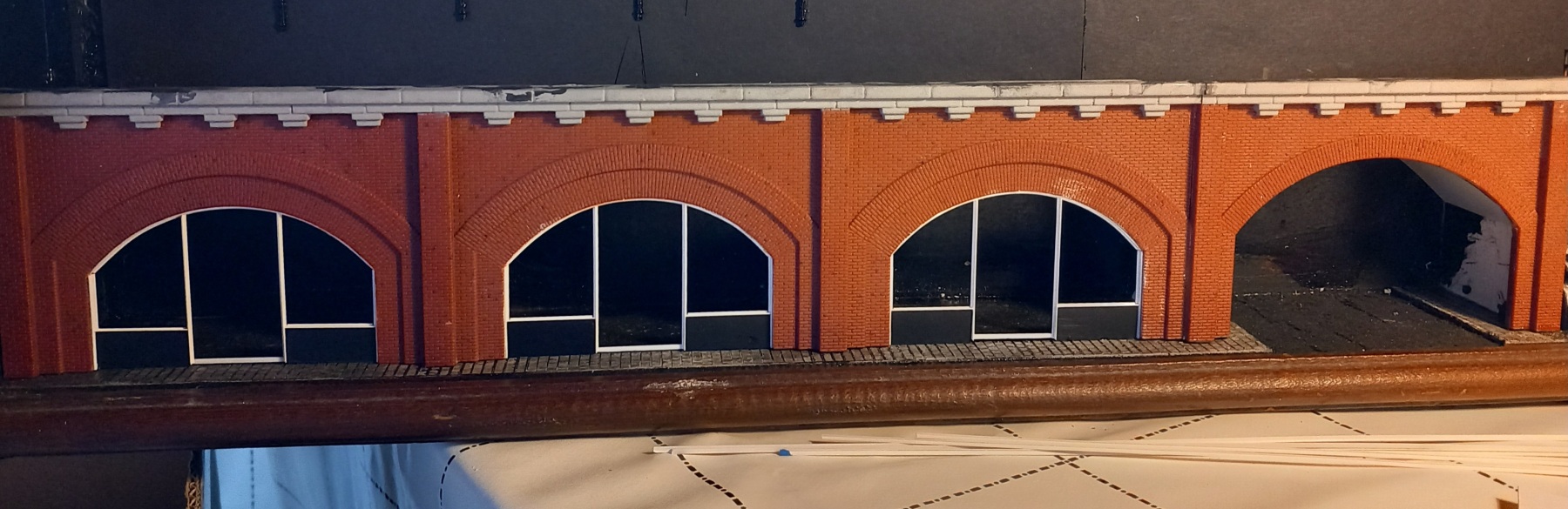 Ondertussen de perronoverkapping op zijn plek. Toevallig komen de bogen precies overeen met de dakventilators van de mat '24.