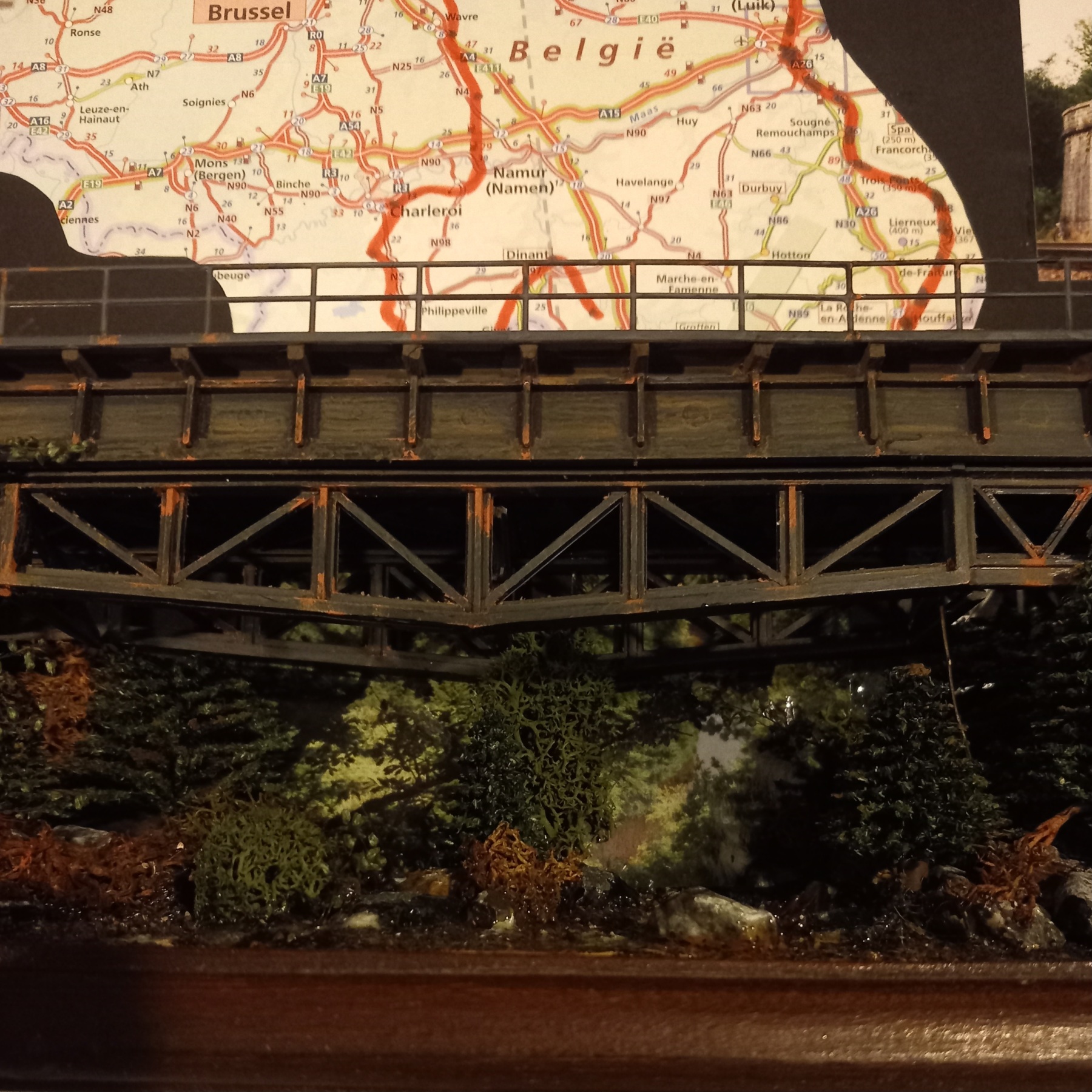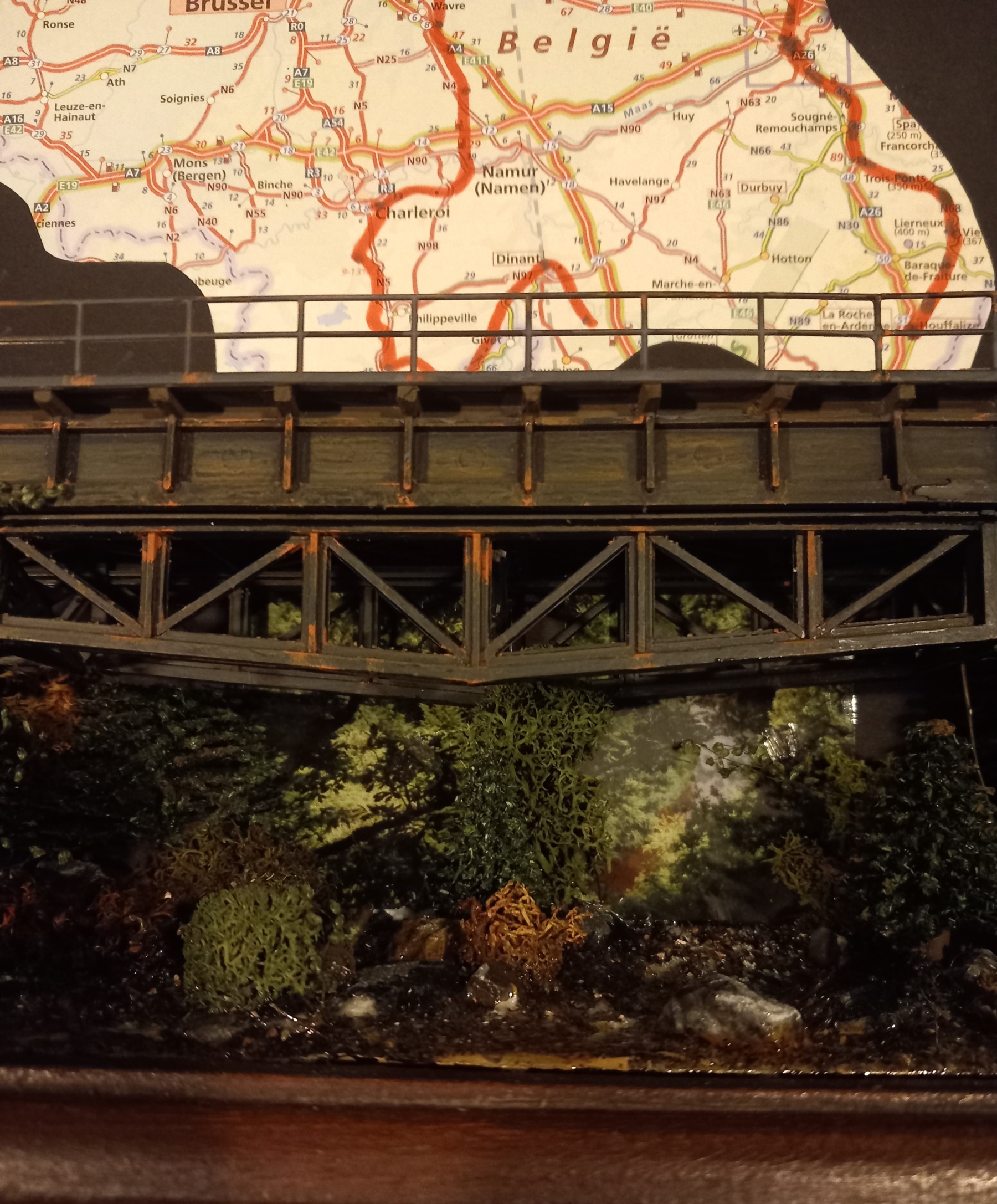 Ff een avondje therapeutisch knutselen. Het riviertje in het Ardennen deel kwam nog zo uit een zwarte achtergrond. Ik had van mijn survivalweek op mijn 15de, nog wat foto's. Van één van deze foto's een watertje in het rechtse deel geplakt, en een bebost stukje op de drooggevallen/ dichtgegroeide linkerhelft. Het randje onderin moet na drogen nog enigszins gecamoufleerd worden. Op de bovenste foto zie je rechts nog een stukje zwarte achtergrond. Op de onderste foto is dit met een extra stukje ook voorzien van achtergrond. Er is een klein beschadigingetje opgetreden, doordat de foto's achter de brug langs moest schuiven, dat was zó dunne speling dat de foto nét erlangs wilde maar dat ging dus niet met een pincet oid. moest ik hem onder de brug zien te schuuven dat moest zonodig met een klein schroevendraaiertje, en ja dat krast :-\. Miss nog wat groen ervoor plakken dan zie je het niet meer, het is sowieso een stuk beter dan zwart karton als achtergrond.