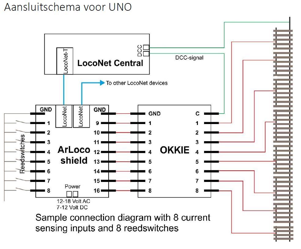 Een plaatje van het aansluitschema van een Arloco met OKKIES: