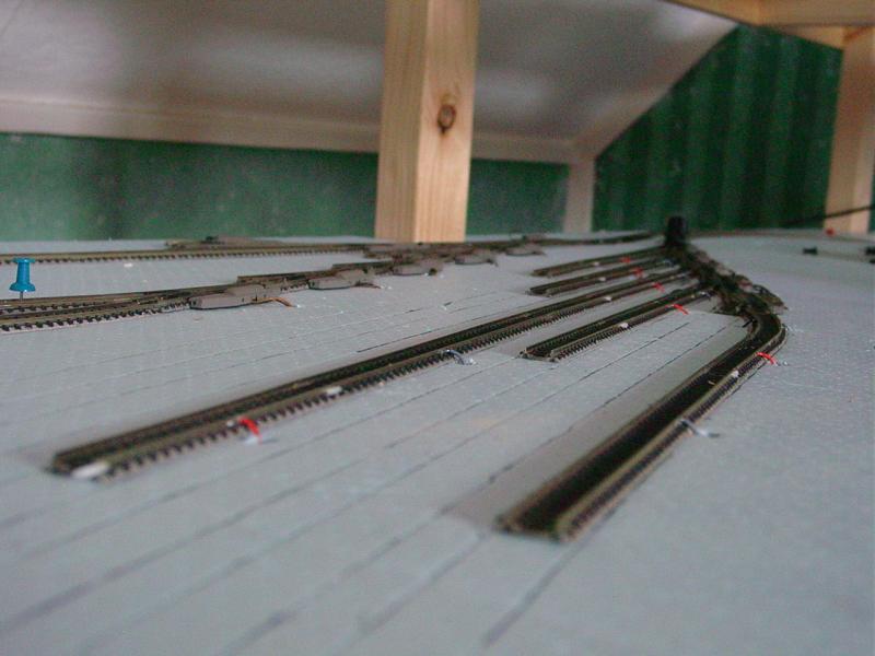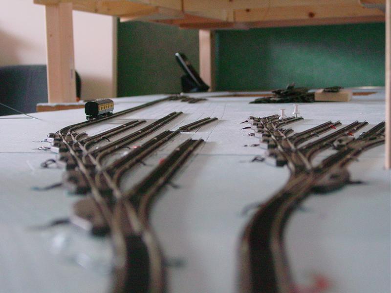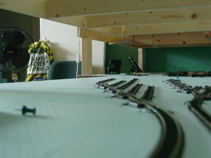Vervolgens rails leggen vanaf de wissels. Eerst alles los aangesloten op de wissels aan de andere zijde, dus waar de zes sporen weer terug naar één gaan. Daarna met pen langs de rails gegaan om te tekenen waarbinnen de rails moeten liggen. En dan leggen maar.