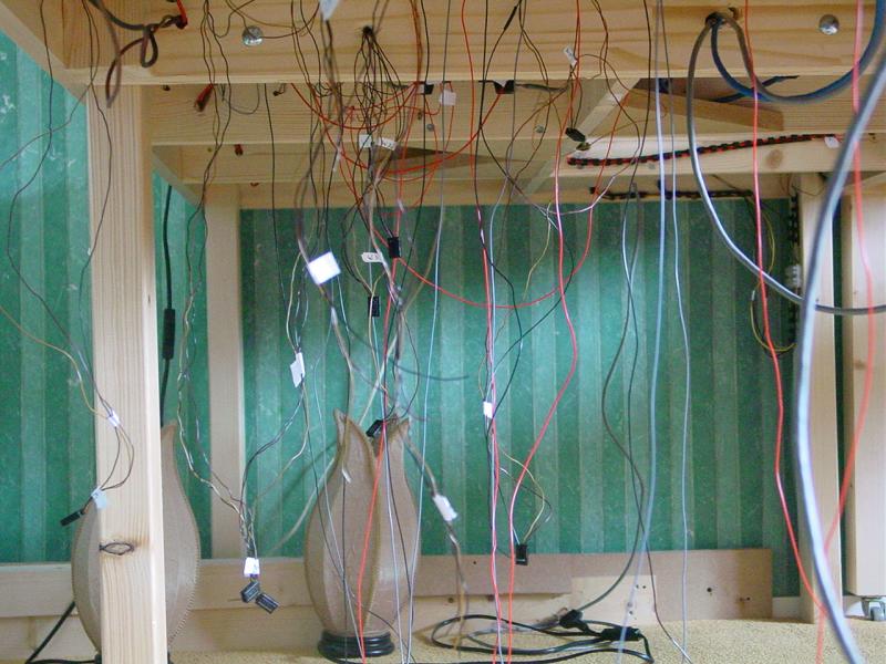 Ik kom er wel uit hoor. Alle draden hebben een codering gekregen op het moment dat ze onder de tafel komen. Dan weet ik welke draad het is, bij welk blok 'ie hoort en waarop ik 'm moet aansluiten. Het is alleen wat meer draad dan in het begin.
