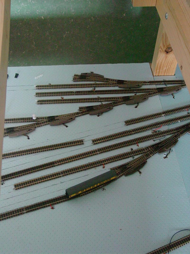 Onderstaand bovenaanzicht kan ik gebruiken om mijn werkwijze uit te leggen. Ik probeer namelijk dit hele vlak (dus tussen de twee hoge latten) af te werken en dan de bedrading aan te passen. Het is wat onhandig om later nog ergens een krimpkousje tussen te plaatsen, dus dat doe ik dan vlak voor vlak. Alle bedrading van dit vlak komt aan de ringleiding die aan de bovenkant van de foto is geplaatst. Tevens komt hier onder de baan de wisseldecoder voor de vijf wissels aan het begin van de diagonale sporen en later nog eens drie wissels aan de andere kant van de diagonale sporen. Die kan ik nu natuurlijk nog niet gaan plaatsen.
