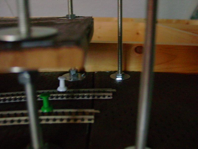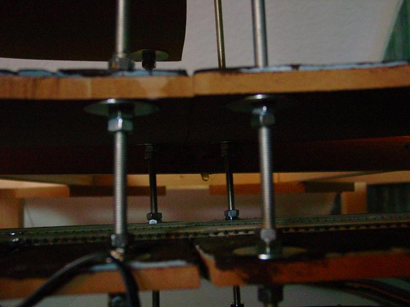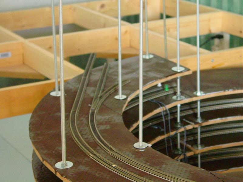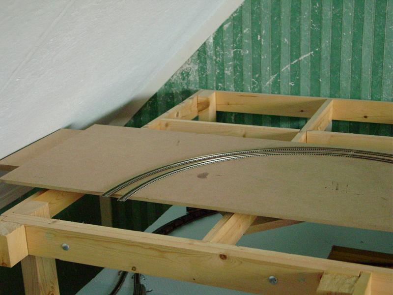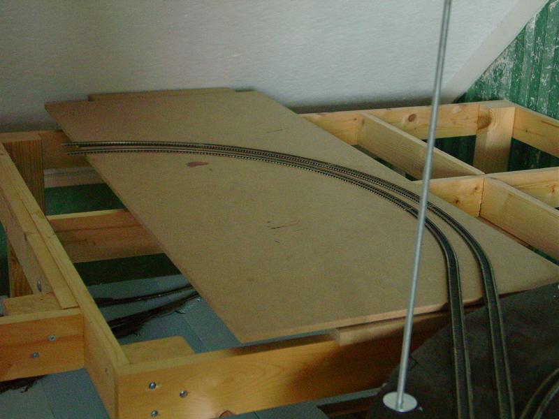 De twee sporen die de spiraal verlaten gaan een stukje rechtdoor en maken dan een boog om evenwijdig aan de achterzijde uit te komen. Hier zullen de sporen aansluiten op het tracé naar het station. Ik heb wat mdf, dat ik nog had, even op het frame gelegd om een idee te krijgen.