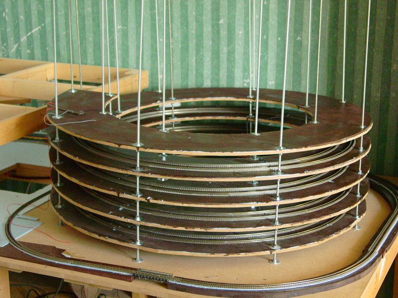 Het zal nog best een leuk bruggencomplex worden bij de spiraal, want ik wil een deel van het dalspoortje om de spiraal (dat uit het schaduwstation komt) ook in het zicht hebben. Daarnaast liggen de twee blauwe sporen bijna een volledige spiraalwending (ca. 5 cm) hoger dan de andere sporen. Het spoor naar beneden toe heeft genoeg ruimte om te dalen en een aansluiting te krijgen. Het spoor naar boven toe zal ik te zijner tijd even moeten bekijken. Misschien zitten er nog leuke fly-overs in.