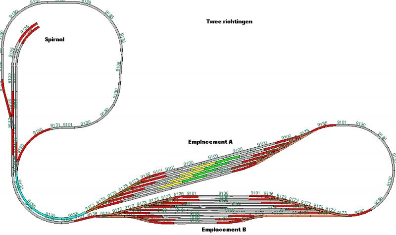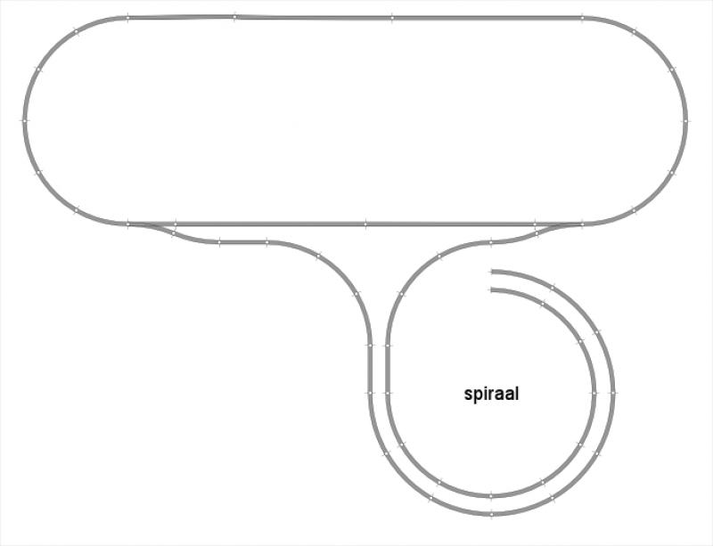 Zoals je ziet, is er nergens een koppeling. Máár met die wissel in de spiraal kan zoiets wel ontstaan. Ik houd daarom wel rekening met een keerlus in het definitieve plan. Die zou dan in het uit de spiraal verdwijnende binnenspoor gaan zitten, dus na de wissel tot de eerstvolgende koppeling op de hoofdbaan. Aangezien ik het bovenplan rustig ga ontwerpen, kan ik met dit tijdelijke plan wel even uit de voeten.