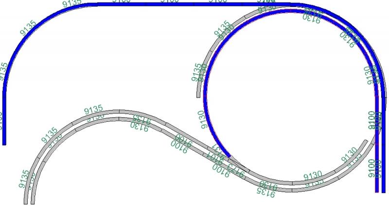 How 'bout this? Voor de tekenvorm is het allemaal enkelsporig, maar dat kan natuurlijk worden aangepast. Helemaal bovenin (breedte is daar 3.50 meter) zie ik een middelgroot station en ergens wat industrie. In het langwerpige ovaal (2.30 x 1.10 meter) een zijlijnstation en een dorp. Dit zou zo maar kunnen.