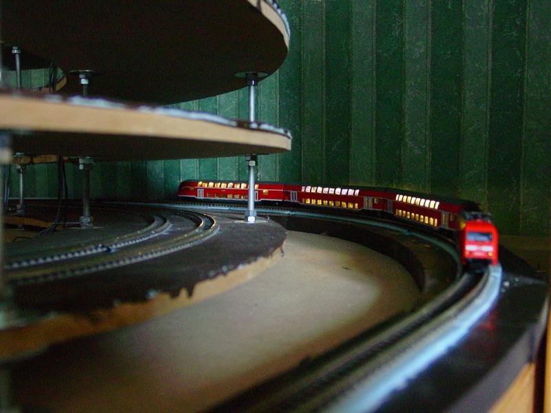 Hieronder verschijnt de trein van achter de spiraal weer in het zicht:
