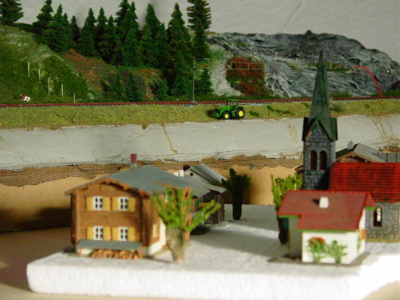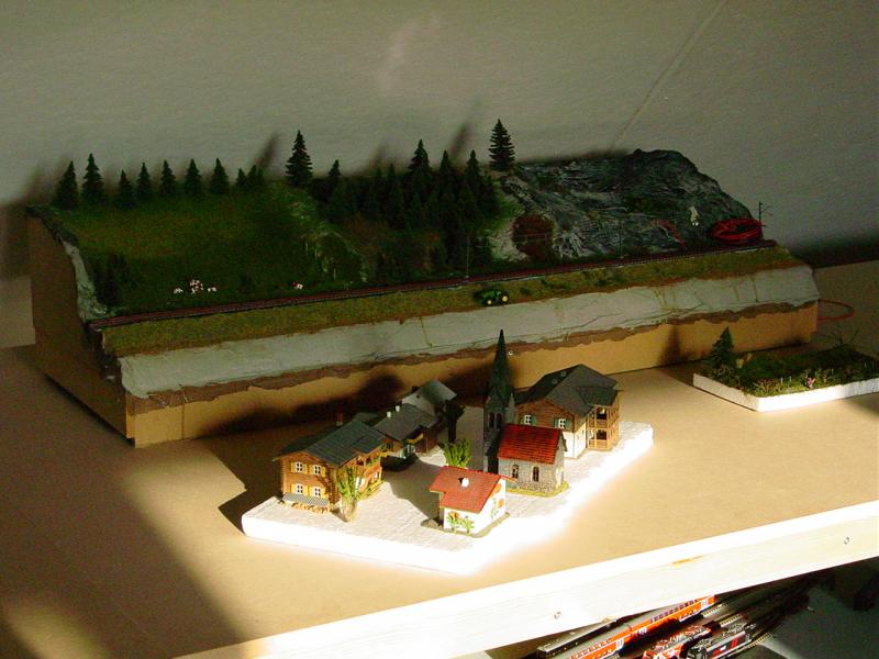 Als je eigenlijk geen tijd hebt en toch wat voor jezelf wilt zien, is het handig gebruik te maken van dingen die snel bij de hand zijn en je ook al hebt liggen. Dus de diorama-oefenbak maar eens op het middelste deel van de boventafels gelegd, het diorama van de workshop en een stukje piepschuim met wat huisjes en boompjes, zeg maar een straatje in een dorpje. Het geeft je meteen een idee hoeveel ruimte je nu eigenlijk hebt.