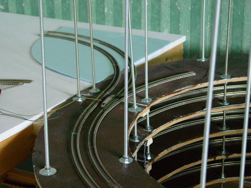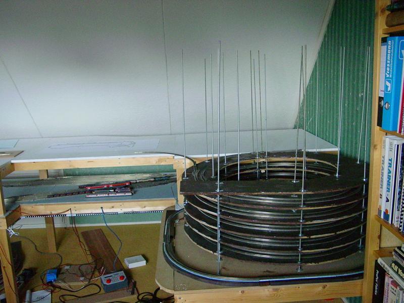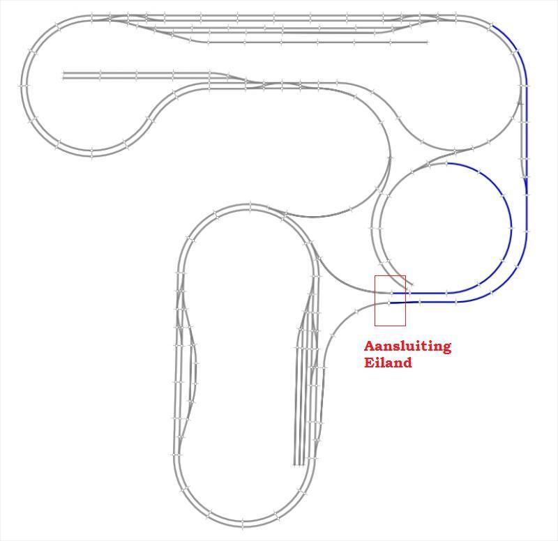 Je hebt nog een oude versie van het plan. Hier zie je de laatste versie. Er steken drie sporen over naar het zogenaamde kookeiland. De twee bovenste sporen komen uit de spiraal, dus vanaf het plankje wat je nu ziet. Het onderste spoor is een tracé dat achter de spiraal langs loopt.
