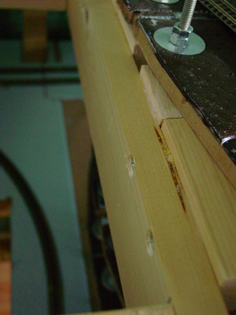Eerst heb ik klosjes aangebracht om de spiraal te 'vangen' op de plek waar twee sporen de spiraal verlaten en naar de platen afbuigen. Dit moet natuurlijk wel secuur gebeuren. Daar wil je geen ontsporingen. Dus klosjes verlijmd en vastgeschroefd en daarna de spiraaldelen erop verlijmd. Eigenlijk zijn het twee klosjes. Ik had er wel één van kunnen maken, maar dan zou het niet recht komen, doordat bij het al gelegde spiraaldeel bredere ringetjes waren gebruikt, vandaar dat je er twee ziet.