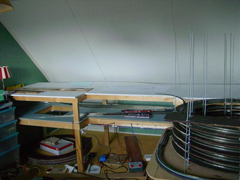 Zo ver is het nog niet helemaal. Ik wil morgen eerst de andere verbinding vanuit de spiraal naar de tafel maken, zodat met het alleen maar neerleggen van rails al even een rondje kan worden gereden. Daarna zal er wel weer het nodige gesoldeerd en gezaagd moeten worden.