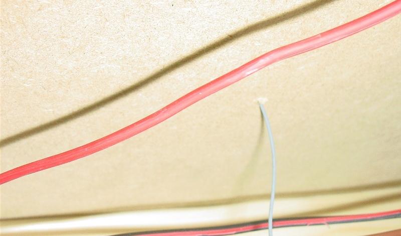 Klein beetje aan de baan gewerkt, want het was fraai weer en we hadden genoeg andere dingen te doen. Toch een klein hoogtepuntje bereikt, want het eerste draadje van een railstuk is onder het tafelblad tevoorschijn gekomen, toevallig aardig in de buurt van de ringleiding. Daar is het overigens niet bij gebleven, maar dat komt later nog wel aan bod. De foto is niet zo best, want zonder flits zag je het grijze draadje niet, met flits is het wel een tikke te licht, maar het gaat niet om de foto, maar om het moment. Althans, voor mij dan.
