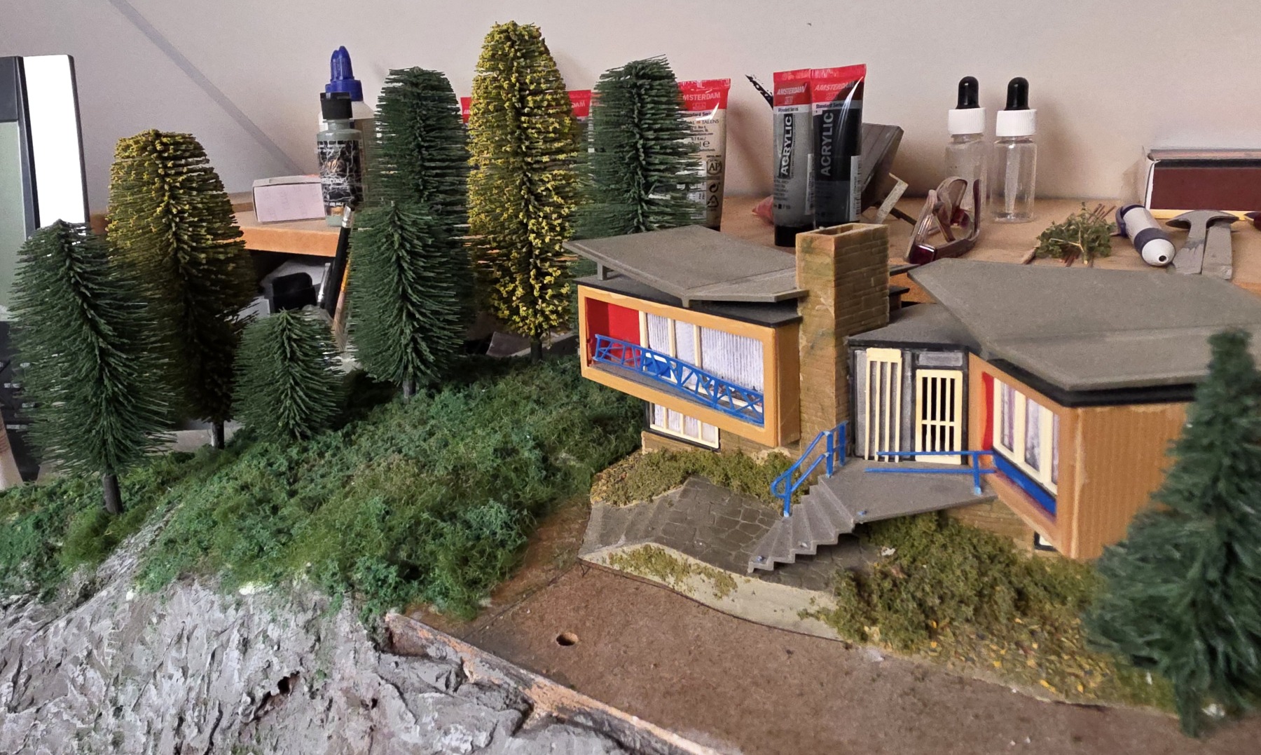 Kritisch puntje, de naaldbomen achter de villa vind ik wat saai, te strak, wat onnatuurlijk.